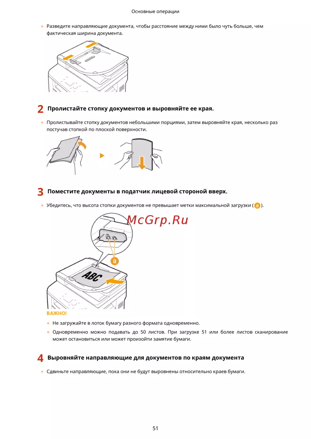 ● Одновременно можно подавать до 50 листов. При загрузке 51 или более листов сканирование