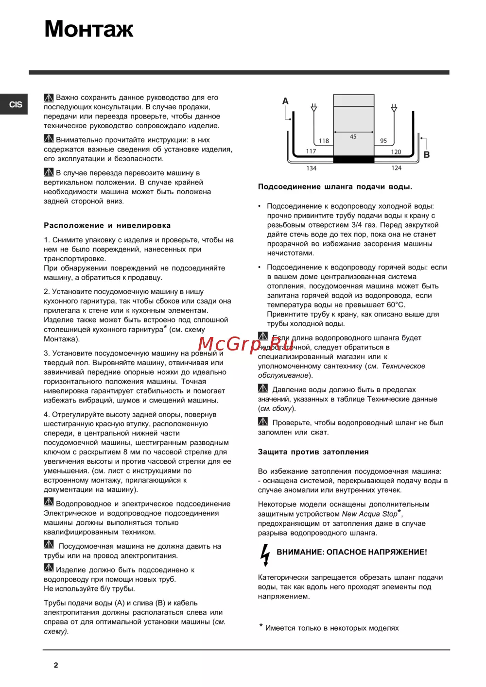 Монтаж CIS Важно сохранить данное руководство для его последующих консультации В случае продажи передачи или переезда проверьте чтобы данное техническое руководство сопровождало изделие И Внимательно прочитайте инструкции в них содержатся важные сведения об установке изделия его эксплуатации и безопасности И В случае переезда перевозите машину в вертикальном положении В случае крайней необходимости машина может быть положена задней стороной вниз Расположение и нивелировка 1 Снимите упаковку с изделия и проверьте чтобы на нем не было повреждений нанесенных при транспортировке При обнаружении повреждений не подсоединяйте машину а обратиться к продавцу 2 Установите посудомоечную машину в нишу кухонного гарнитура так чтобы сбоков или сзади она прилегала к стене или к кухонным элементам Изделие также может быть встроено под сплошной столешницей кухонного гарнитура см схему Монтажа 3 Установите посудомоечную машину на ровный и твердый пол Выровняйте машину отвинчивая или завинчивай передние опорные ножки до идеально горизонтального положения машины Точная нивелировка гарантирует стабильность и помогает избежать вибраций шумов и смещений машины 4 Отрегулируйте высоту задней опоры повернув шестигранную красную втулку расположенную спереди в центральной нижней части посудомоечной машины шестигранным разводным ключом с раскрытием 8 мм по часовой стрелке для увеличения высоты и против часовой стрелки для ее уменьшения см лист с инструкциями по встроенному монтажу прилагающийся к документации на машину Водопроводное и электрическое подсоединение Электрическое и водопроводное подсоединения машины должны выполняться только квалифицированным техником та Посудомоечная машина не должна давить на трубы или на провод электропитания та Изделие должно быть подсоединено к водопроводу при помощи новых труб Не используйте б у трубы Трубы подачи воды А и слива В и кабель электропитания должны располагаться слева или справа от для оптимальной установки машины см схему 2 Подсоединение шланга подачи воды Подсоединение к водопроводу холодной воды прочно привинтите трубу подачи воды к крану с резьбовым отверстием 3 4 газ Перед закруткой дайте стечь воде до тех пор пока она не станет прозрачной во избежание засорения машины нечистотами Подсоединение к водопроводу горячей воды если в вашем доме централизованная система отопления посудомоечная машина может быть запитана горячей водой из водопровода если температура воды не превышает 60 С Привинтите трубу к крану как описано выше для трубы холодной воды та Если длина водопроводного шланга будет недостаточной следует обратиться в специализированный магазин или к уполномоченному сантехнику см Техническое обслуживание та Давление воды должно быть в пределах значений указанных в таблице Технические данные см сбоку та Проверьте чтобы водопроводный шланг не был заломлен или сжат Защита против затопления Во избежание затопления посудомоечная машина оснащена системой перекрывающей подачу воды в случае аномалии или внутренних утечек Некоторые модели оснащены дополнительным защитным устройством New Acqua Stop предохраняющим от затопления даже в случае разрыва водопроводного шланга ВНИМАНИЕ ОПАСНОЕ НАПРЯЖЕНИЕ Категорически запрещается обрезать шланг подачи воды так ка