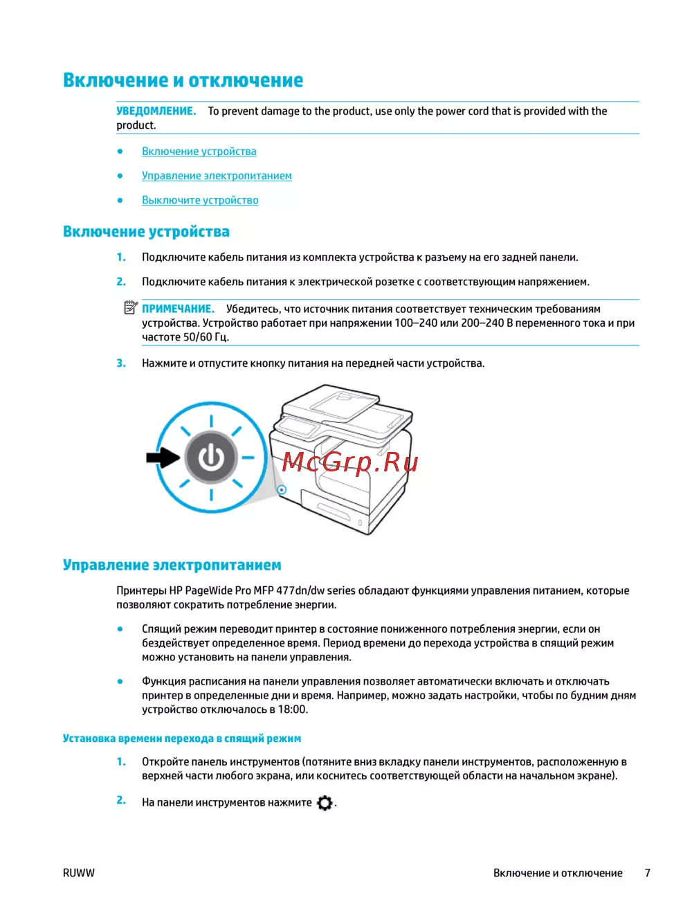 Принтеры HP PageWide Pro MFP 477dn/dw series обладают функциями управления питанием, которые
