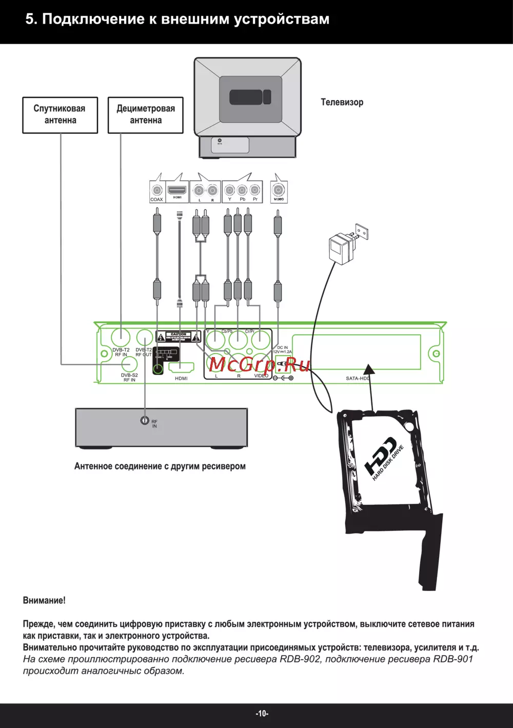 5 Подключение к внешним устройствам Внимание Прежде чем соединить цифровую приставку с любым электронным устройством выключите сетевое питания как приставки так и электронного устройства Внимательно прочитайте руководство по эксплуатации присоединямых устройств телевизора усилителя и т д На схеме проиллюстрированно подключение ресивера ИОВ 902 подключение ресивера R О В 901 происходит аналогичные образом