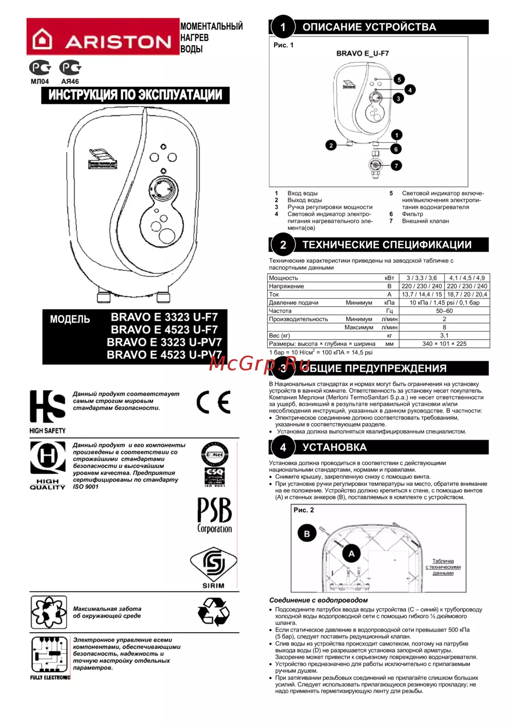 Ariston Bravo E 4523 U-F7Инструкция по эксплуатации -