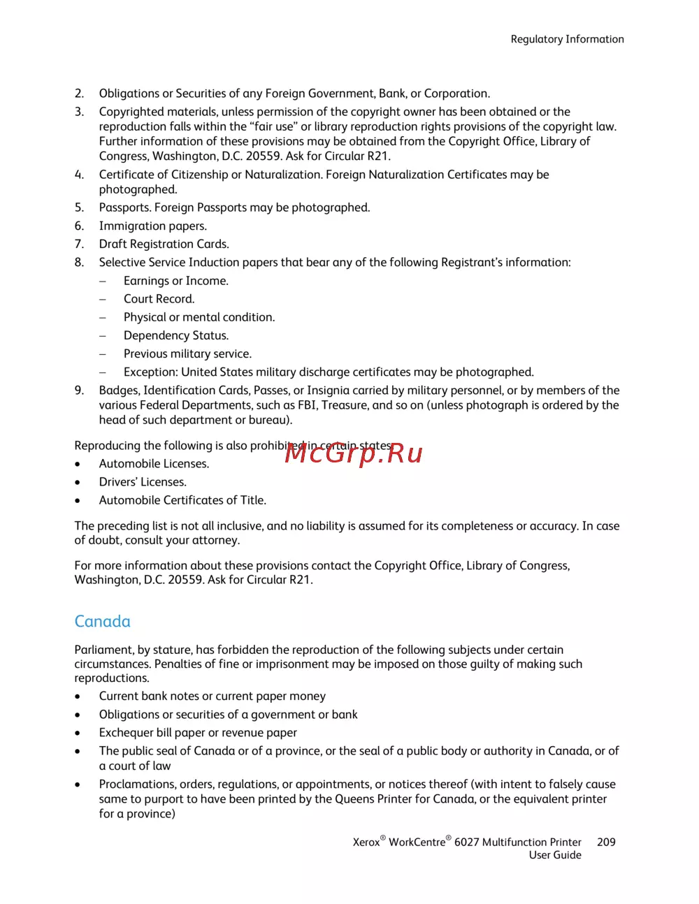 Xerox workcentre 6027ni — общие правила и ограничения на воспроизведение документов [209/222]