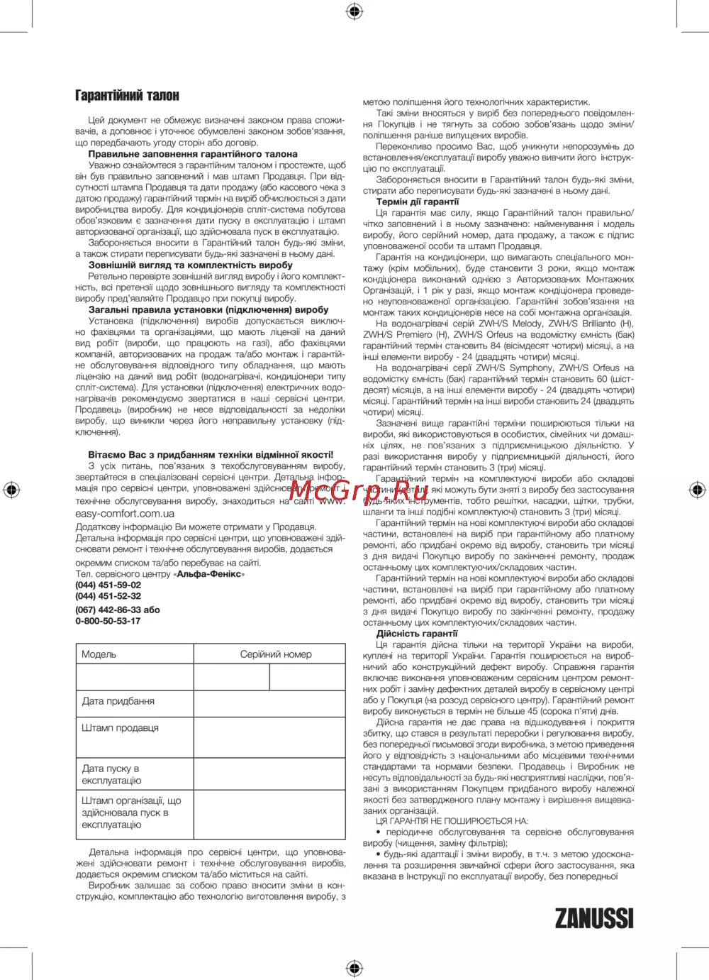 Гаранпйний талон Цей документ не обмежуе визначей законом права споживач в а доповнюе i уточнюе обумовлей законом зобов язання що передбачають угоду стор н або дого р Правильне заповнення гарантийного талона Уважно ознайомтеся з гаранпйним талоном i простежте щоб в н був правильно заповнений i мав штамп Продавца При в дсутност штампа Продавца та дати продажу або касового чека з датою продажу гаранпйний терм н на вир б обчислюеться з дати виробництва виробу Для кондицюнер в спл т система побутова обов язковим е зазначення дати пуску в експлуатацю i штамп авторизовано орган зац що здйснювала пуск в експлуатацю Забороняеться вносити в Гаранпйний талон будь як зм ни а також стирати переписувати будь яю зазначей в ньому дай Зовн шн й вигляд та комплектнють виробу Ретельно nepeeipTe зовн шн й вигляд виробу i його комплекгнють вс лретензп щодо зовн шнього вигляду та комплектности виробу пред являйте Продавцю при покупц виробу Загальн правила установки п дключення виробу Установка пщключення вироб в допускаеться виключно фах вцями та орган зац ями що мають л цензГГ на даний вид робн вироби що працюють на газ або фах вцями компан1Й авторизованих на продаж та або монтаж i гаранпйне обслуговування в дпов дного типу обладнання що мають л ценз ю на даний вид робгг водонагрГвач кондицюнери типу спл т система Для установки п дключення електричних водонагр вач в рекомендуемо звертатися в наш сервюн центри Продавець виробник не несе в дпов дальност за недолжи виробу що виникли через його неправильну установку п дключення Впаемо Вас з придбанням техн ки в дм нноТ якостН 3 ycix питань пов язаних з техобслуговуванням виробу звертайтеся в спец ал зоеан сервюн центри Детальна нформаця про сервюн центри уповноважен зд йснювати ремонт i техйчне обслуговування виробу знаходиться на сайт www easy comfort сот ua Додаткову нформацю Ви можете отримати у Продавця Детальна нформац я про cepsicni центри що уповноважен зд йснюеати ремонт i техйчне обслуговування виробйв додаеться окремим списком та або перебувае на сайг Тел сервисного центру Альфа Фейке 044 451 59 02 044 451 52 32 067 442 86 33 або 0 800 50 53 17 метою пол1пшення його технолопчних характеристик Так зм1ни вносяться у вириб без попереднього повщомлення Покупав i не тягнуть за собою зобов язань щодо зм ни пол пшення ранние випущених вироб1в Переконливо просимо Вас щоб уникнуги непорозум нь до встановлення експлуатацГГ виробу уважно вивчити його нструкц ю по експлуатацГГ Забороняеться вносити в Гаранпйний талон будь як змии стирати або переписувати будь як зазначей в ньому дай Терм н дГГ гарантГГ Ця гарантия мае силу якщо Гарант йний талон правильно ч тко заповнений в ньому зазначено найменування модель виробу його сер йний номер дата продажу а також е п дпис уповноваженоГ особи та штамп Продавця Гаранпя на кондиц1онери що вимагають спесуального мон тажу кр1м моб льних буде становити 3 роки якщо монтаж кондщюнера виконаний одйею з Авторизованих Монтажних Орган зац й i 1 р к у раз якщо монтаж кондщюнера проведе но неуповноваженб оргайзац1ею Гарантий зобов язання на монтаж таких кондицюнер в несе на соб монтажна орган 1зац я На водонагр вач сер й ZWH S Melody ZWH S Brillianto Н ZWH S Premiero Н ZWH S Orfeus на водом стку емнють бак гаранпйний терм н становить 84 йс мдесят чотири м сяц а на нш елементи виробу 24 двадцять чотири м сяц1 На водонагр вач cepii ZWH S Sympho