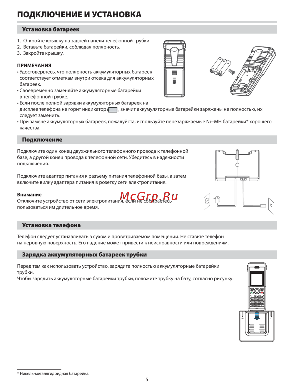 Чтобы зарядить аккумуляторные батарейки трубки, положите трубку на базу, согласно рисунку:
