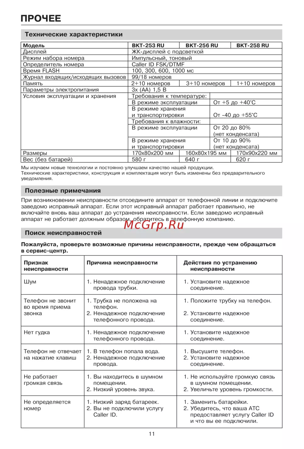 ПРОЧЕЕ Технические характеристики Модель Дисплей Режим набора номера Определитель номера Время FLASH Журнал входящих исходящих вызовов Память Параметры электропитания Условия эксплуатации и хранения Размеры Вес без батарей ВКТ 253 RU BKT 256 RU ВКТ 258 RU ЖК дисплей с подсветкой Импульсный тоновый Caller ID FSK DTMF 100 300 600 1000 мс 99 18 номеров 2 10 номеров 3 10 номеров 1 10 номеров Зх АА 1 5 В Требования к температуре В режиме эксплуатации От 5 до 40 С В режиме хранения и транспортировки От 40 до 55 С Требования к влажности В режиме эксплуатации От 20 до 80 нет конденсата В режиме хранения От 10 до 90 и транспортировки нет конденсата 170x80x200 мм 160x80x195 мм 170x90x220 мм 580 г 640 г 620 г Мы изучаем новые технологии и постоянно улучшаем качество нашей продукции Технические характеристики конструкция и комплектация могут быть изменены без предварительного уведомления Полезные примечания При возникновении неисправности отсоедините аппарат от телефонной линии и подключите заведомо исправный аппарат Если этот исправный аппарат работает правильно не включайте вновь ваш аппарат до устранения неисправности Если заведомо исправный аппарат не работает должным образом обратитесь в телефонную компанию Поиск неисправностей Пожалуйста проверьте возможные причины неисправности прежде чем обращаться в сервис центр Признак неисправности Причина неисправности Действия по устранению неисправности Шум 1 Ненадежное подключение провода трубки 1 Установите надежное соединение Телефон не звонит во время приема звонка 1 Трубка не положена на телефон 2 Ненадежное подключение телефонного провода 1 Положите трубку на телефон 2 Установите надежное соединение Нет гудка 1 Ненадежное подключение телефонного провода 1 Установите надежное соединение Телефон не отвечает на нажатие клавиш 1 В телефон попала вода 2 Ненадежное подключение провода 1 Высушите телефон 2 Установите надежное соединение Не работает громкая связь 1 Вы находитесь в шумном помещении 2 Низкий уровень звука 1 Не используйте громкую связь в шумном помещении 2 Увеличьте уровень громкости Не определяется номер 1 Низкий заряд батареек 2 Вы не подключили услугу Caller ID 1 Заменить батарейки 2 Убедитесь что ваша АТС предоставляет услугу Caller ID и что вы ее подключили 11