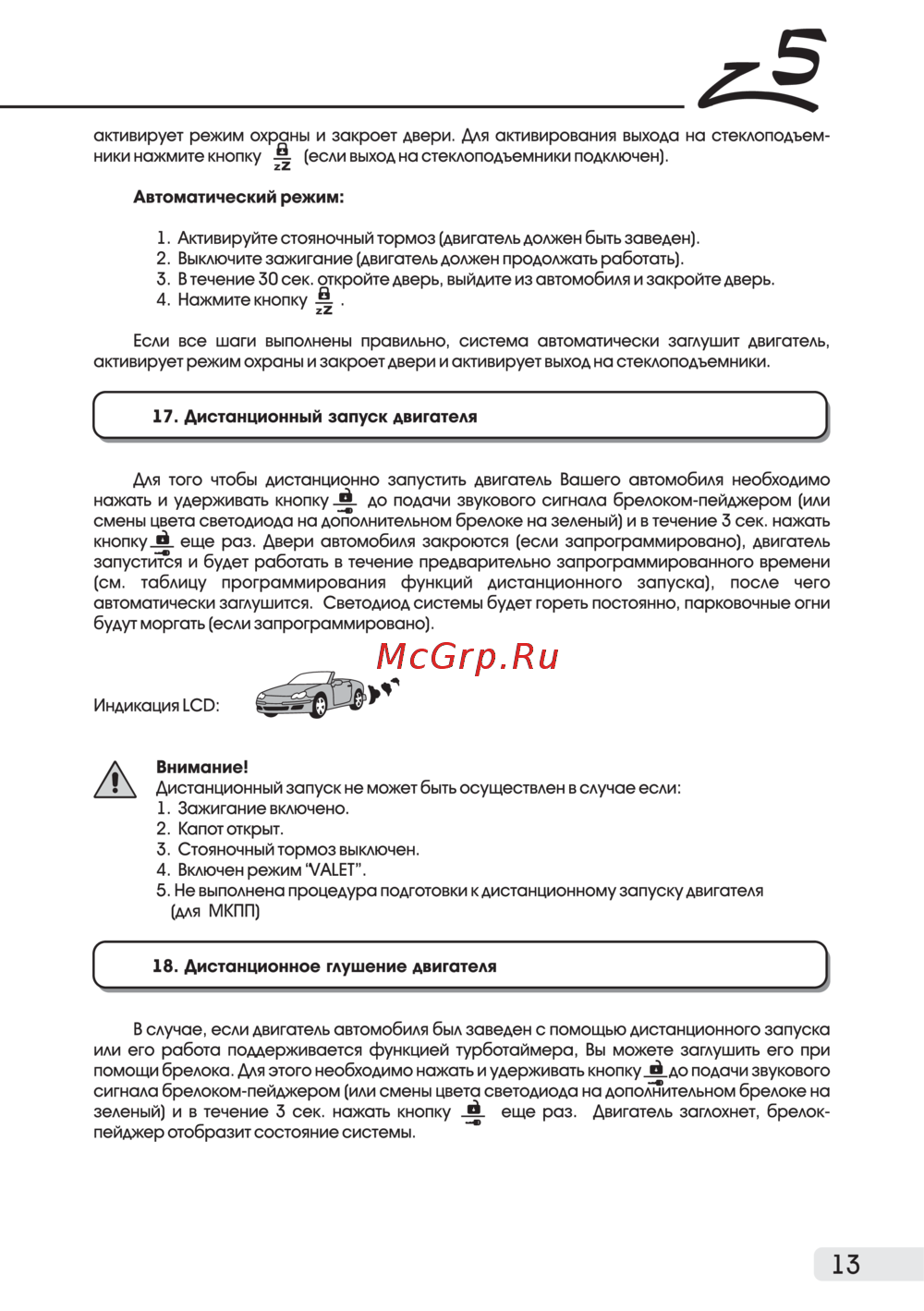 активирует режим охраны и закроет двери Для активирования выхода на стеклоподъем ники нажмите кнопку если выход на стеклоподъемники подключен Автоматический режим 1 Активируйте стояночный тормоз двигатель должен быть заведен 2 Выключите зажигание двигатель должен продолжать работать 3 В течение 30 сек откройте дверь выйдите из автомобиля и закройте дверь 4 Нажмите кнопку Если все шаги выполнены правильно система автоматически заглушит двигатель активирует режим охраны и закроет двери и активирует выход на стеклоподъемники 17 Дистанционный запуск двигателя Для того чтобы дистанционно запустить двигатель Вашего автомобиля необходимо нажать и удерживать кнопку _Й до подачи звукового сигнала брелоком пейджером или смены цвета светодиода на дополнительном брелоке на зеленый и в течение 3 сек нажать кнопку_ еще раз Двери автомобиля закроются если запрограммировано двигатель запустится и будет работать в течение предварительно запрограммированного времени см таблицу программирования функций дистанционного запуска после чего автоматически заглушится Светодиод системы будет гореть постоянно парковочные огни будут моргать если запрограммировано Индикация LCD Внимание Дистанционный запуск не может быть осуществлен в случае если 1 Зажигание включено 2 Капот открыт 3 Стояночный тормоз выключен 4 Включен режим VALET 5 Не выполнена процедура подготовки к дистанционному запуску двигателя для МКПП 18 Дистанционное глушение двигателя В случае если двигатель автомобиля был заведен с помощью дистанционного запуска или его работа поддерживается функцией турботаймера Вы можете заглушить его при помощи брелока Для этого необходимо нажать и удерживать кнопку Ь ло подачи звукового сигнала брелоком пейджером или смены цвета светодиода на дополнительном брелоке на зеленый и в течение 3 сек нажать кнопку _Й_ еще раз Двигатель заглохнет брелокпейджер отобразит состояние системы 13