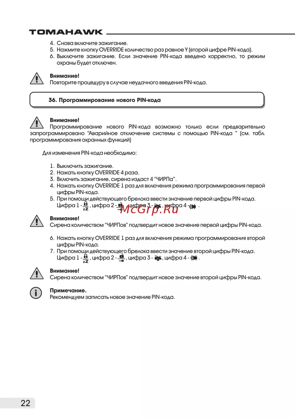 TOMAHAWK________________________________________________________ 4 Снова включите зажигание 5 Нажмите кнопку OVERRIDE количество раз равное Y второй цифре PIN кода 6 Выключите зажигание Если значение PIN кода введено корректно то режим охраны будет отключен Внимание Повторите процедуру в случае неудачного введения PIN кода 36 Программирование нового PIN кода Внимание Программирование нового PIN кода возможно только если предварительно запрограммировано Аварийное отключение системы с помощью PIN кода см табл программирования охранных функций Д Для изменения PIN кода необходимо 1 Выключить зажигание 2 Нажать кнопку OVERRIDE 4 раза 3 Включить зажигание сирена издаст 4 ЧИРПа 4 Нажать кнопку OVERRIDE 1 раз для включения режима программирования первой цифры PIN кода 5 При помощи действующего брелока ввести значение первой цифры PIN кода Цифра 1 цифра 2 d цифра 3 gs цифра 4 Внимание Сирена количеством ЧИРПов подтвердит новое значение первой цифры PIN кода Д 6 Нажать кнопку OVERRIDE 1 раз для включения режима программирования второй цифры PIN кода 7 При помощи действующего брелока ввести значение второй цифры PIN кода Цифра 1 А цифра 2 JL цифра 3 цифра 4 Внимание Сирена количеством ЧИРПов подтвердит новое значение второй цифры PIN кода Д Примечание Рекомендуем записать новое значение PIN кода 22