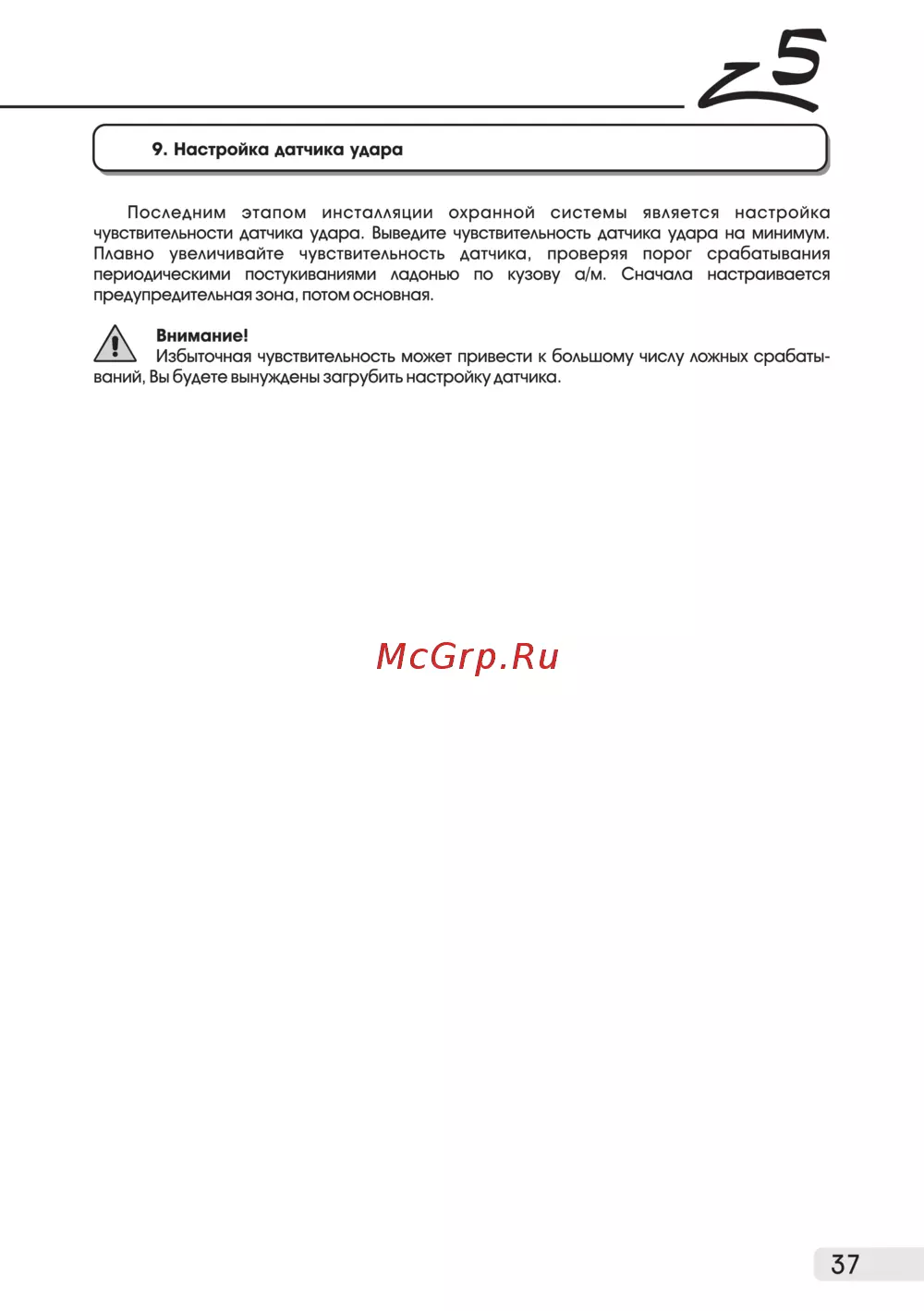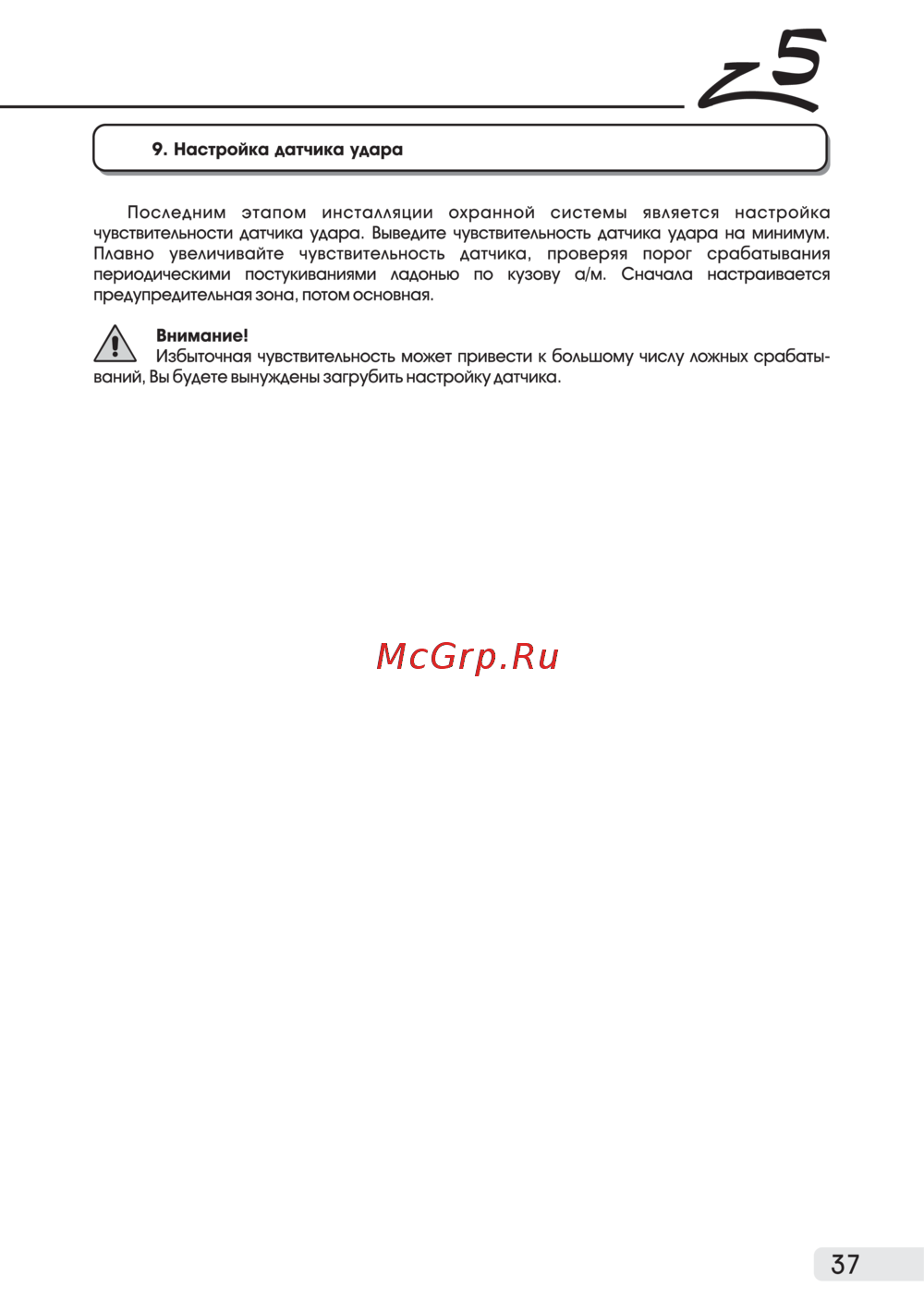 5 9 Настройка датчика удара Последним этапом инсталляции охранной системы является настройка чувствительности датчика удара Выведите чувствительность датчика удара на минимум Плавно увеличивайте чувствительность датчика проверяя порог срабатывания периодическими постукиваниями ладонью по кузову а м Сначала настраивается предупредительная зона потом основная Внимание Избыточная чувствительность может привести к большому числу ложных срабаты ваний Вы будете вынуждены затрубить настройку датчика 37