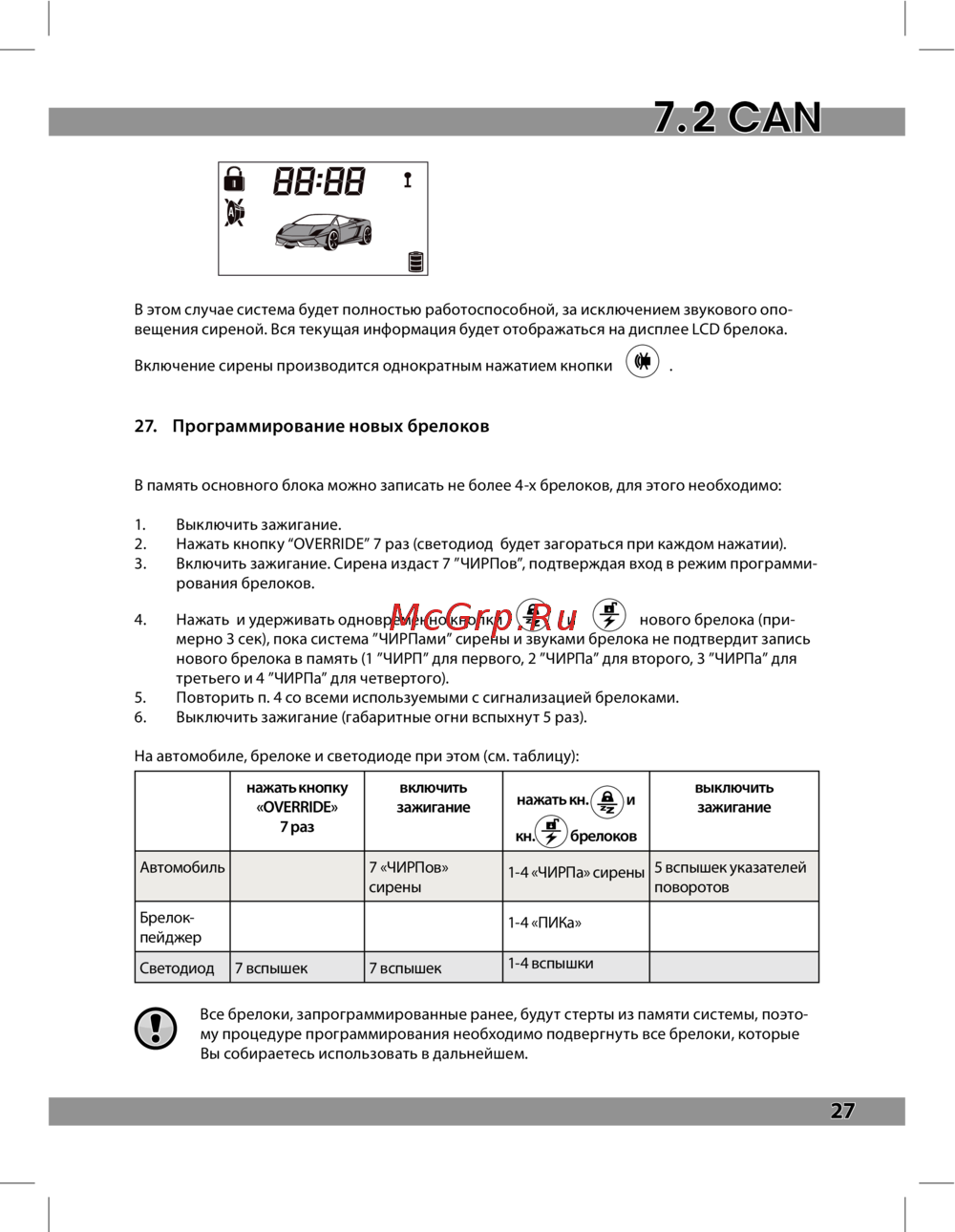 Все брелоки, запрограммированные ранее, будут стерты из памяти системы, поэто-