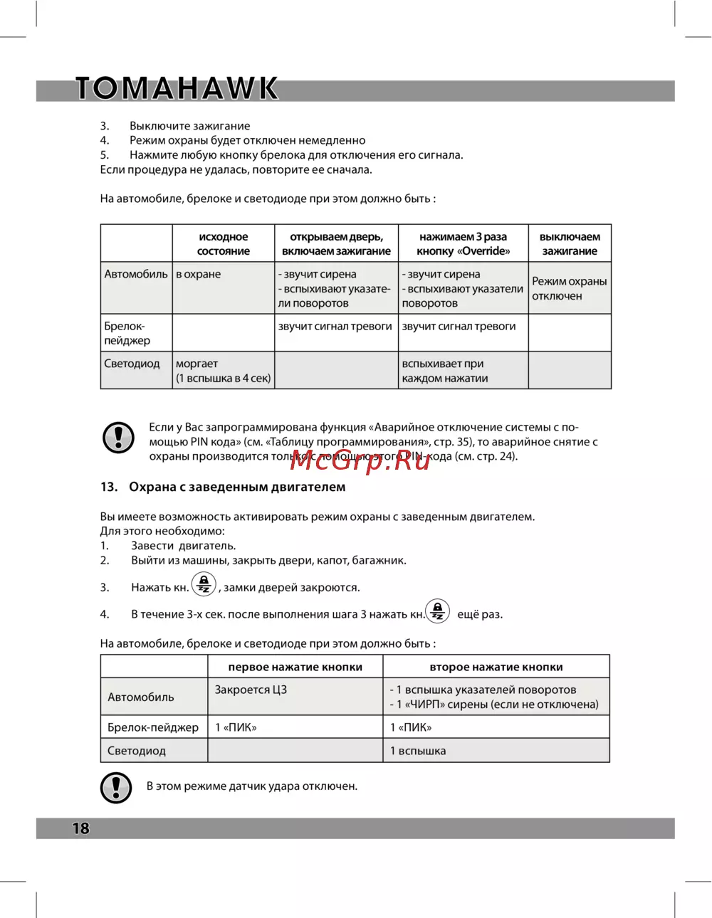 Tomahawk 9.7 CAN — инструкция по отключению охраны автомобиля и активации режима [18/52]