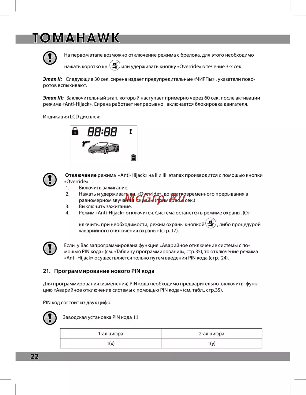 Tomahawk 9.7 CAN — инструкция по отключению режима Anti-Hijack и программированию PIN [22/52]