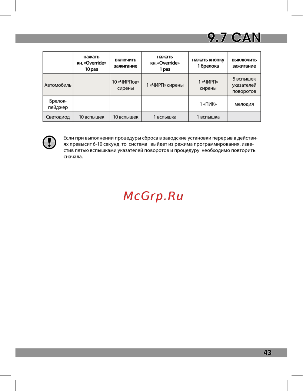 Tomahawk 9.7 CAN — инструкция по сбросу системы автомобиля в заводские настройки [43/52]
