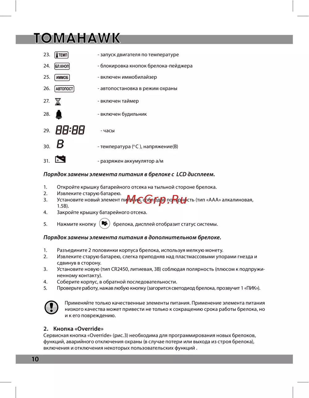 - Порядок замены элемента питания в брелоке с lcd дисплеем p.10