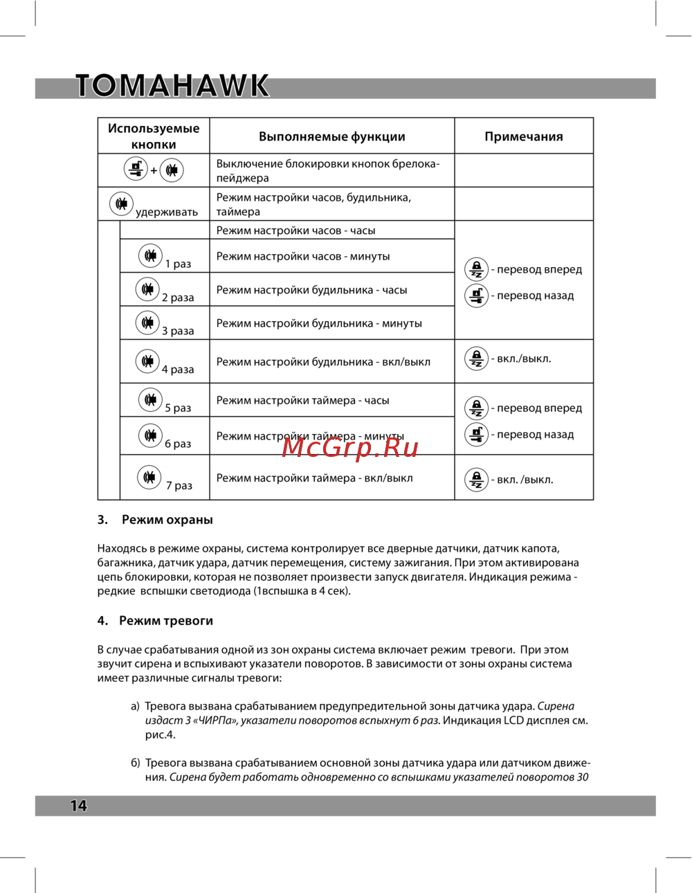 Tomahawk G-9000 CAN — инструкция по использованию кнопок и режимов охраны системы [14/56]