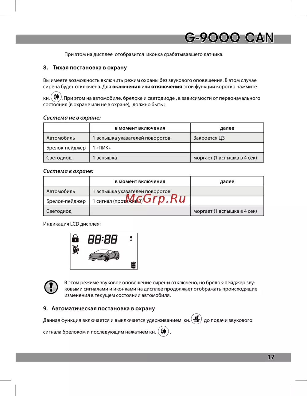 Tomahawk G-9000 CAN — функции охранной системы: тихая и автоматическая постановка [17/56]