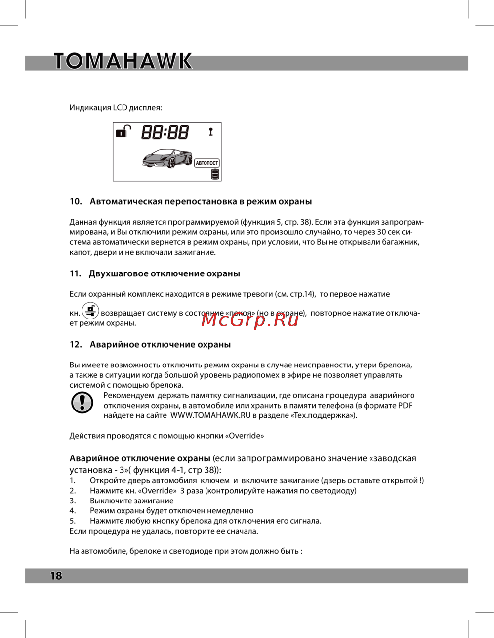 Tomahawk G-9000 CAN — функции охранной системы: автоматическое отключение и аварийный режим [18/56]
