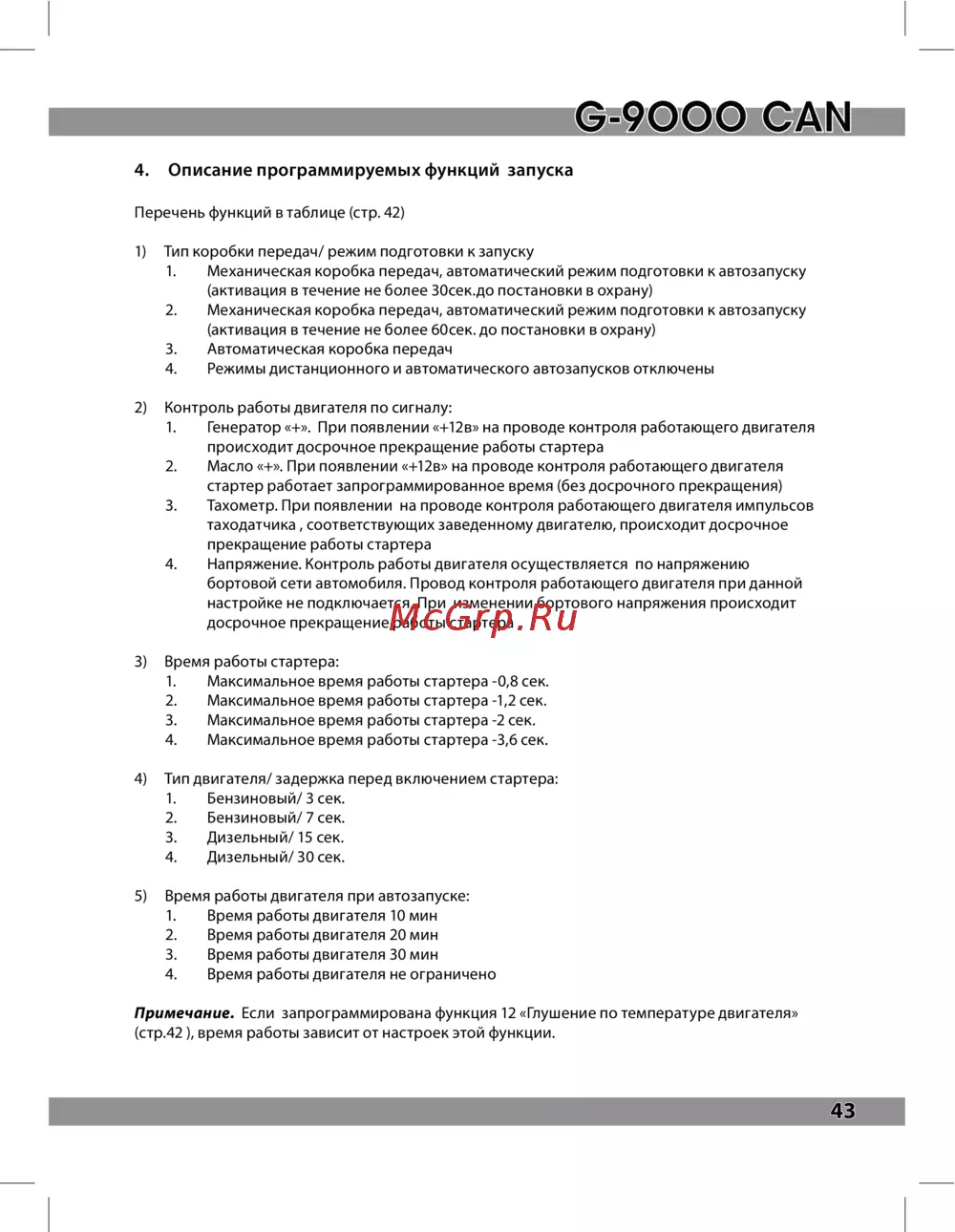 Изучите программируемые функции автозапуска, включая режимы работы стартера и контроль двигателя. Узнайте о настройках для различных типов коробок передач и двигателей.
