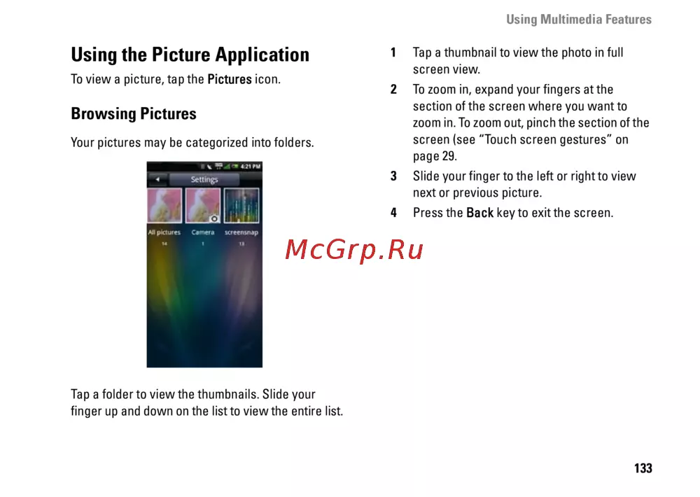 screen (see “Touch screen gestures” on