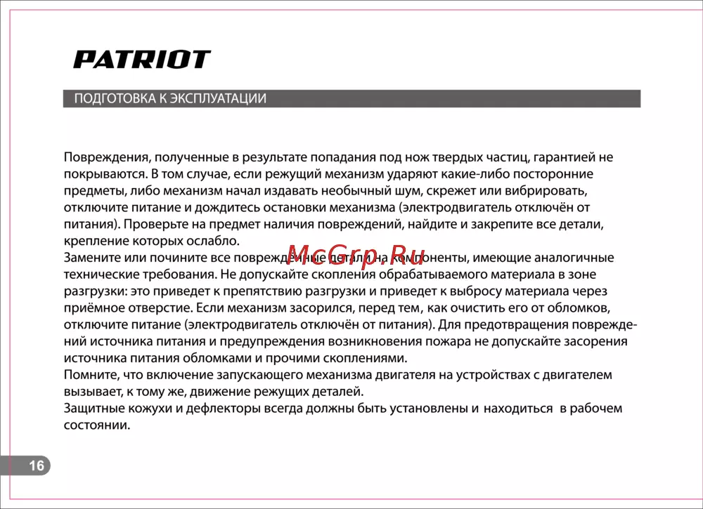 РАТРЮТ ПОДГОТОВКА К ЭКСПЛУАТАЦИИ Повреждения полученные в результате попадания под нож твердых частиц гарантией не покрываются В том случае если режущий механизм ударяют какие либо посторонние предметы либо механизм начал издавать необычный шум скрежет или вибрировать отключите питание и дождитесь остановки механизма электродвигатель отключён от питания Проверьте на предмет наличия повреждений найдите и закрепите все детали крепление которых ослабло Замените или почините все повреждённые детали на компоненты имеющие аналогичные технические требования Не допускайте скопления обрабатываемого материала в зоне разгрузки это приведет к препятствию разгрузки и приведет к выбросу материала через приёмное отверстие Если механизм засорился перед тем как очистить его от обломков отключите питание электродвигатель отключён от питания Для предотвращения поврежде ний источника питания и предупреждения возникновения пожара не допускайте засорения источника питания обломками и прочими скоплениями Помните что включение запускающего механизма двигателя на устройствах с двигателем вызывает к тому же движение режущих деталей Защитные кожухи и дефлекторы всегда должны быть установлены и находиться в рабочем состоянии