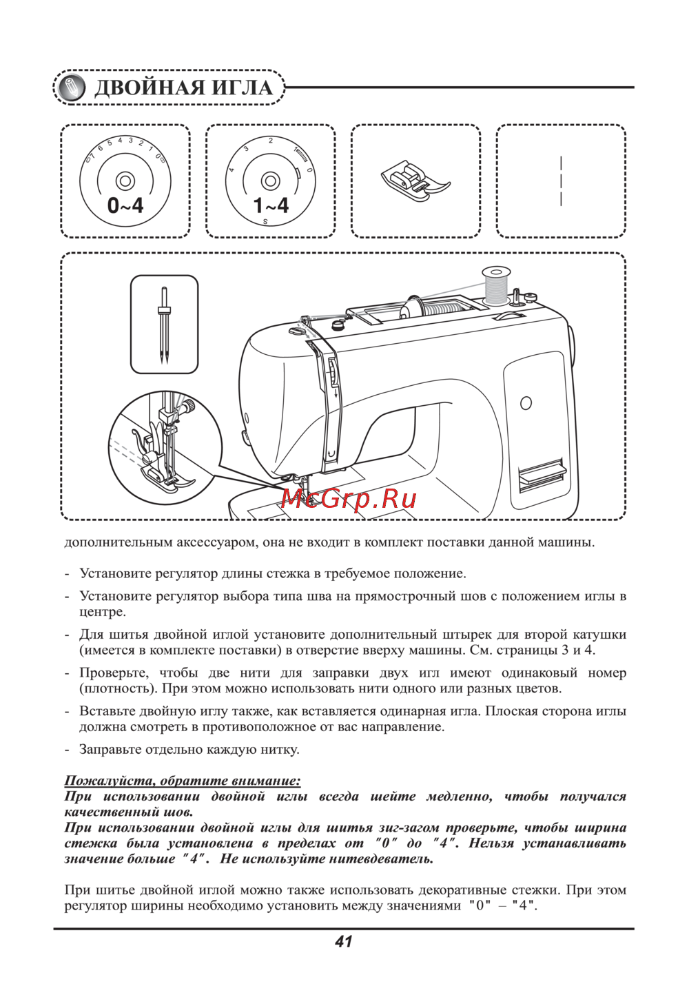 ДВОЙНАЯ ИГЛА дополнительным аксессуаром она не входит в комплект поставки данной машины Установите регулятор длины стежка в требуемое положение Установите регулятор выбора типа шва на прямострочный шов с положением иглы в центре Для шитья двойной иглой установите дополнительный штырек для второй катушки имеется в комплекте поставки в отверстие вверху машины См страницы 3 и 4 Проверьте чтобы две нити для заправки двух игл имеют одинаковый плотность При этом можно использовать нити одного или разных цветов номер Вставьте двойную иглу также как вставляется одинарная игла Плоская сторона иглы должна смотреть в противоположное от вас направление Заправьте отдельно каждую нитку Пожалуйста обратите внимание При использовании двойной иглы всегда шейте медленно чтобы получался качественный шов При использовании двойной иглы для шитья зиг загом проверьте чтобы ширина стежка была установлена в пределах от О до 4 Нельзя устанавливать значение больше 4 Не используйте нитевдеватель При шитье двойной иглой можно также использовать декоративные стежки При этом регулятор ширины необходимо установить между значениями 0 4 41