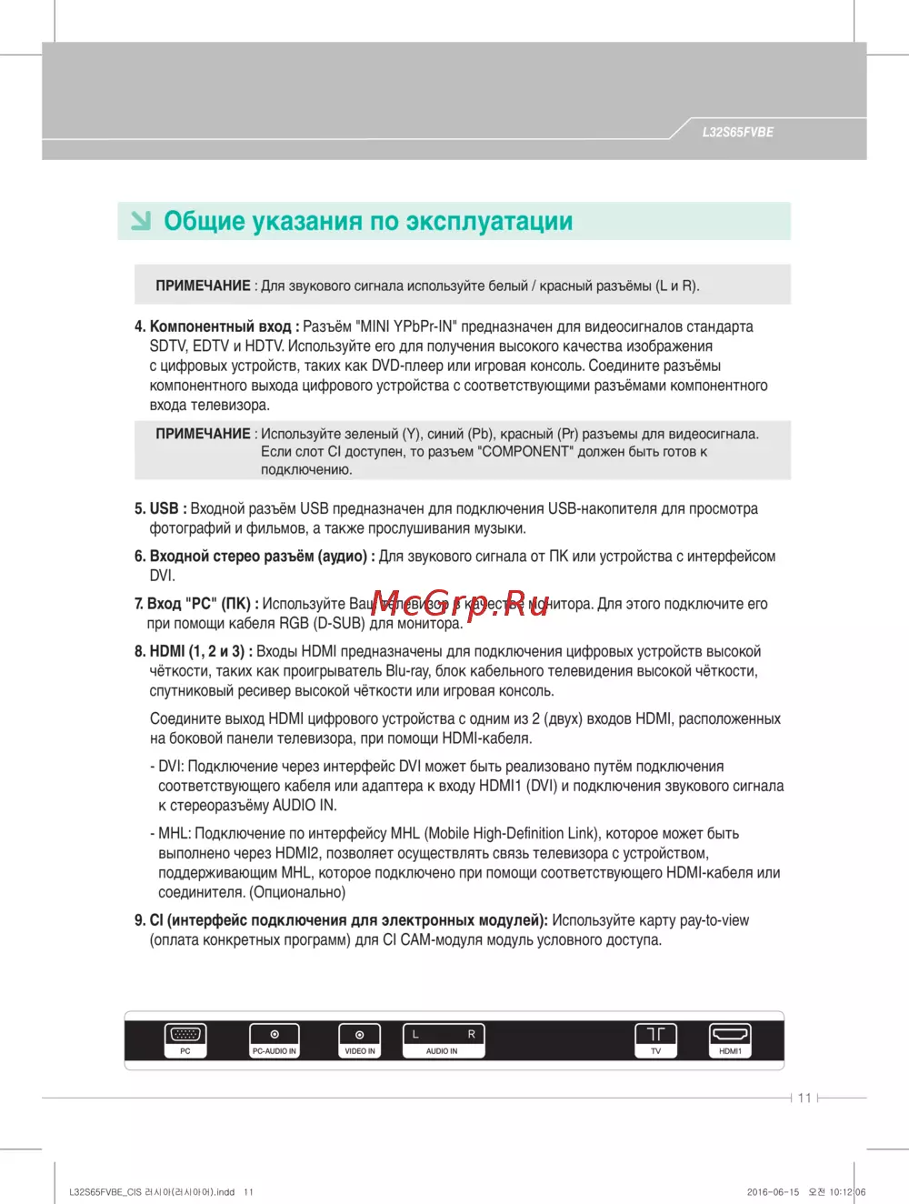 7. Вход "PC" (ПК) : Используйте Ваш телевизор в качестве монитора. Для этого подключите его