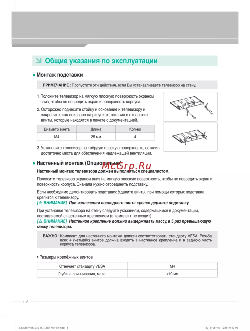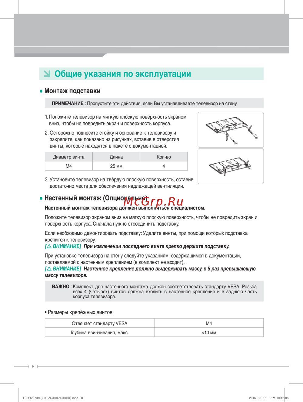 ВАЖНО : Комплект для настенного монтажа должен соответствовать стандарту VESA. Резьба