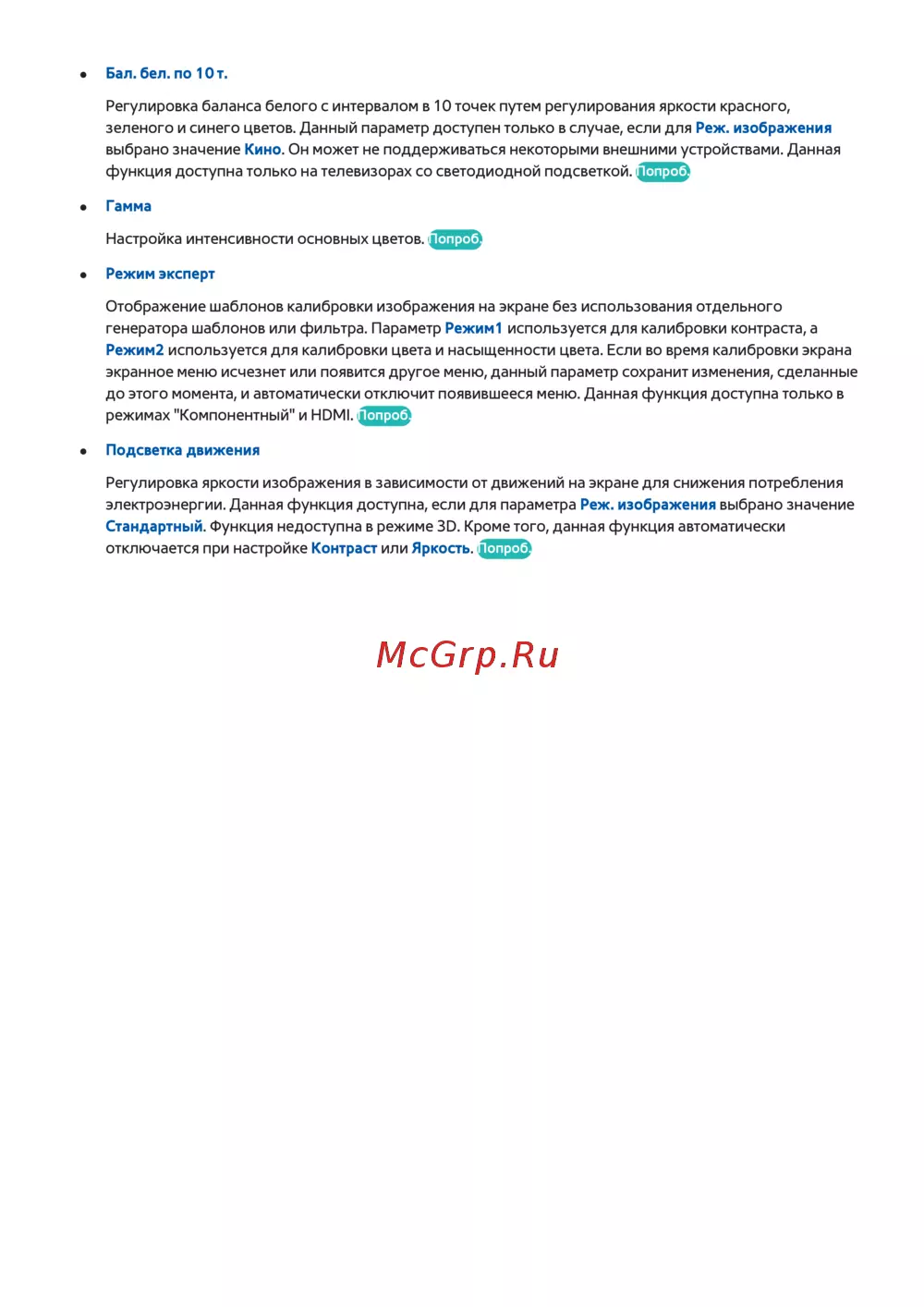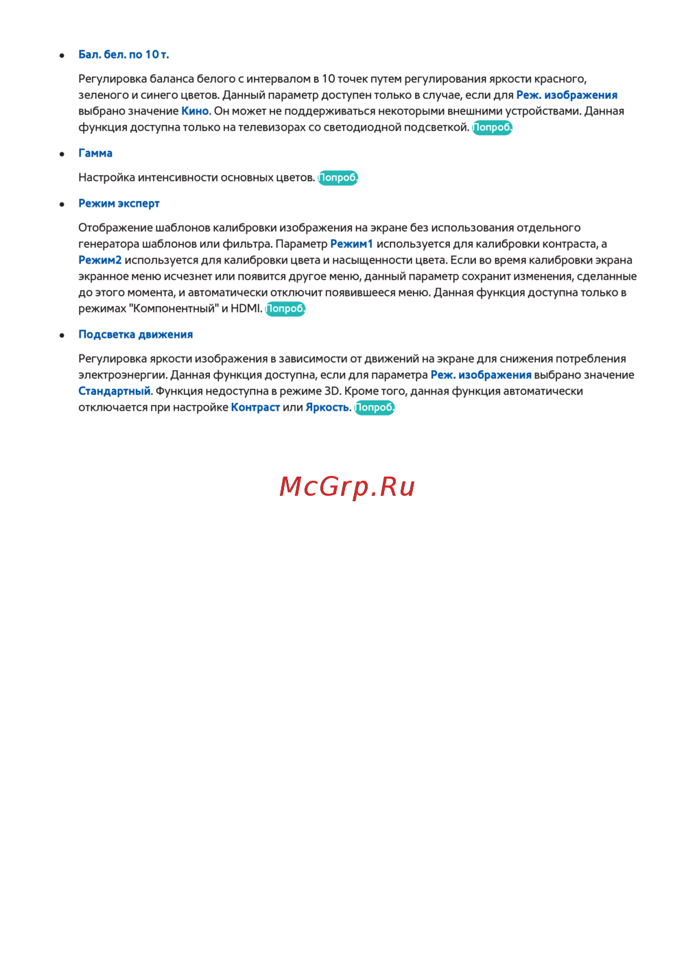 Узнайте, как настроить баланс белого, гамму и режимы калибровки изображения для оптимального качества на экране. Подробности о доступных функциях.