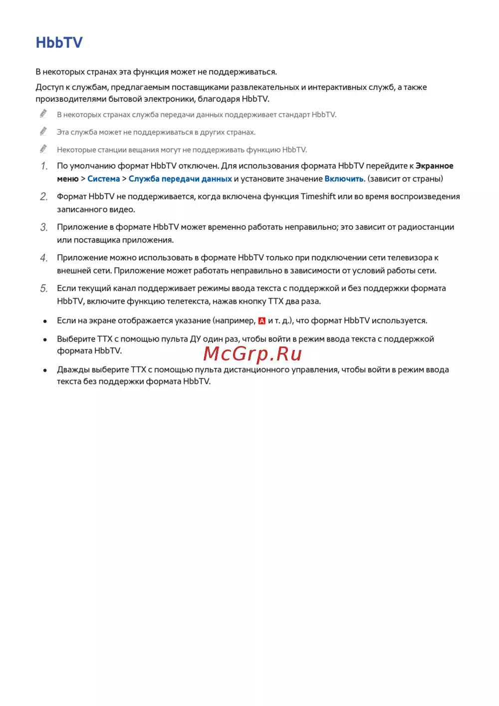Формат HbbTV не поддерживается, когда включена функция Timeshift или во время воспроизведения