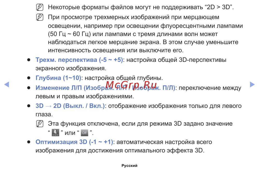 - Мере надевайте при просмотре очки 3d active glasses и выберите соответствующее значение режима 3d в представленном ниже списке что позволит вам получить оптимальное 3d изображение p.123