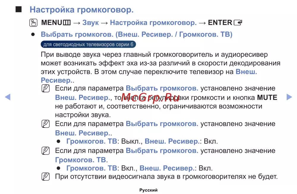 При выводе звука через главный громкоговоритель и аудиоресивер