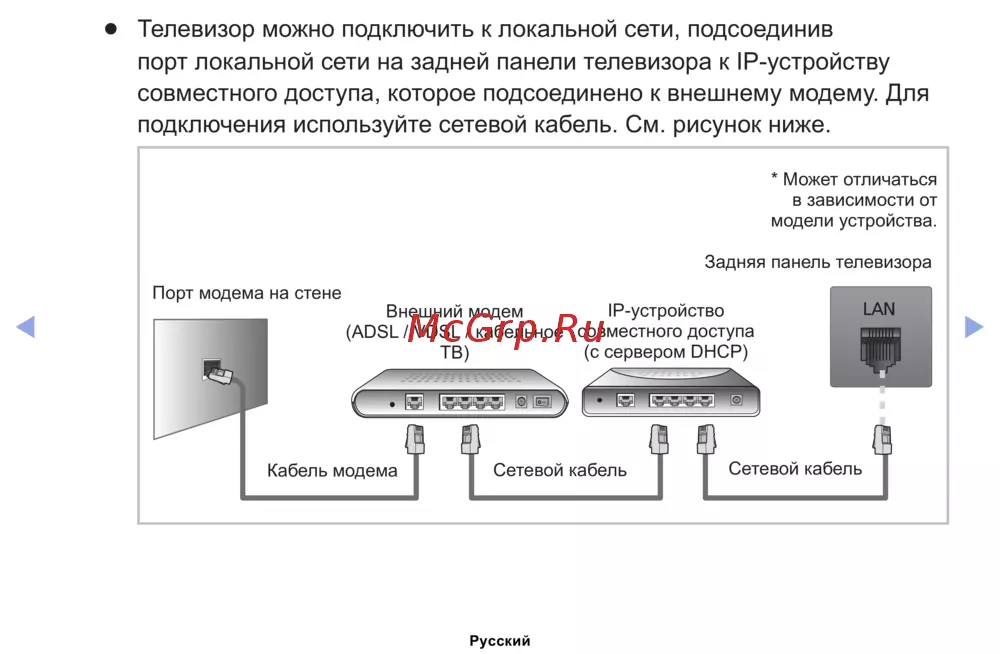 - Порт локальной сети на задней панели телевизора к ip устройству совместного доступа которое подсоединено к внешнему модему для подключения используйте сетевой кабель см рисунок ниже p.60