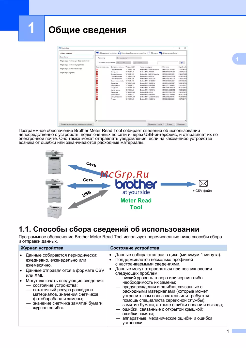 Программное обеспечение Brother Meter Read Tool использует перечисленные ниже способы сбора