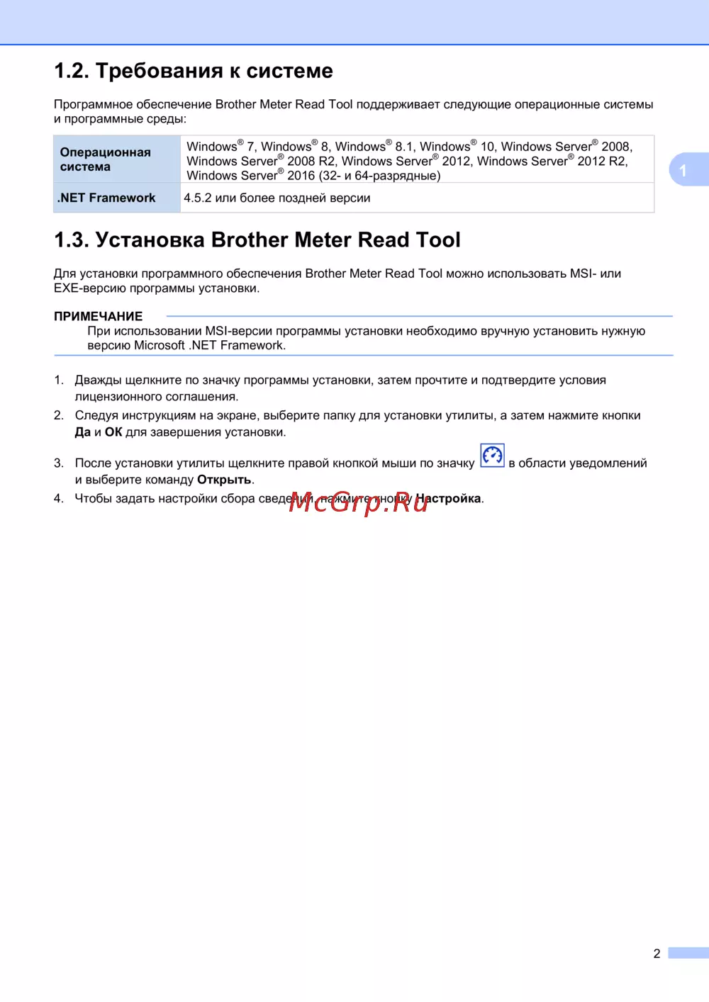 Для установки программного обеспечения Brother Meter Read Tool можно использовать MSI- или