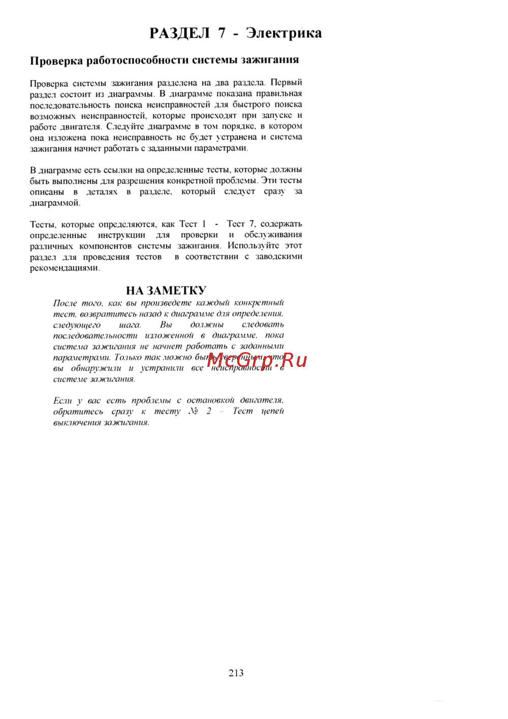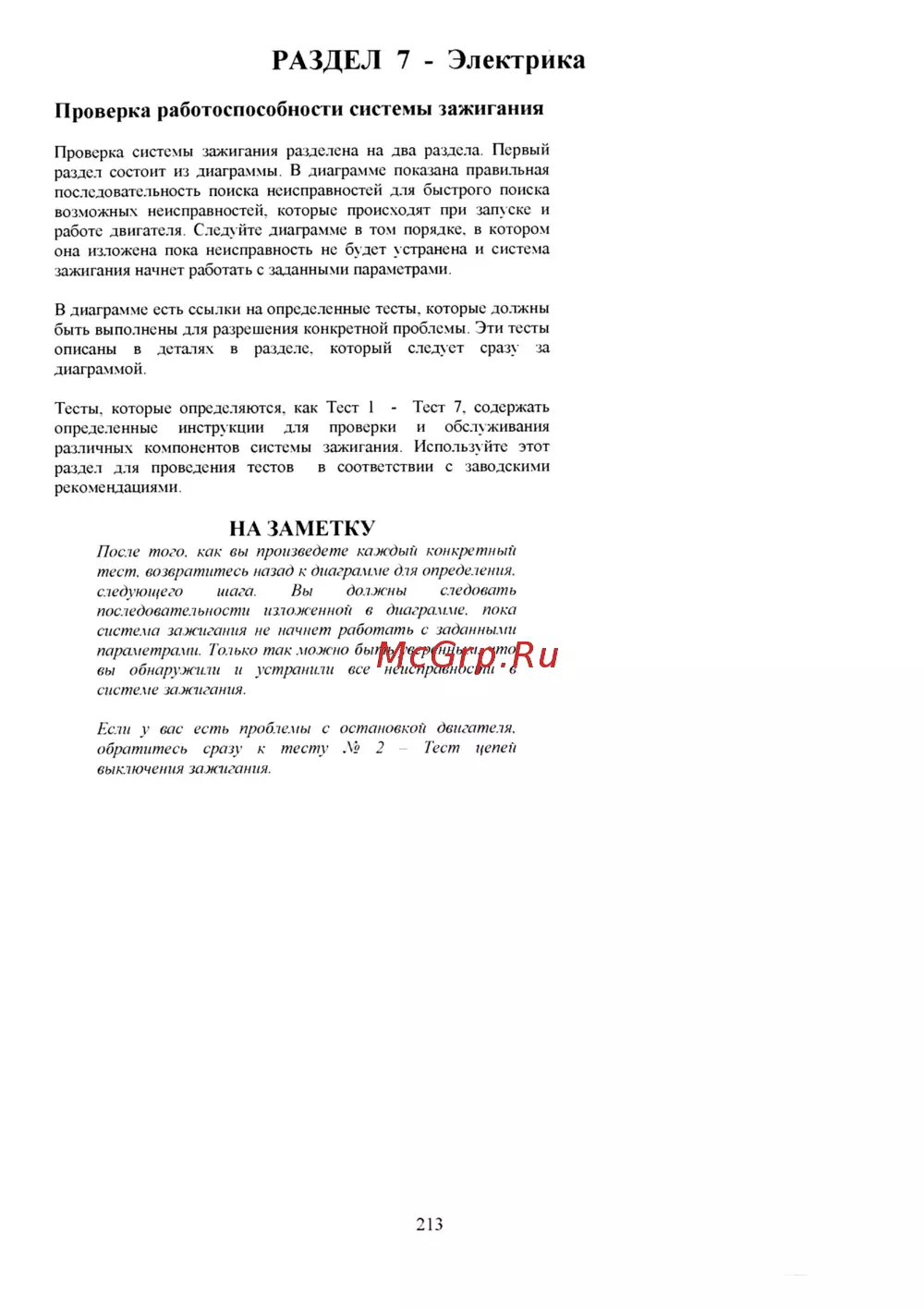 РАЗДЕЛ 7 Электрика Проверка работоспособности системы зажигания Проверка системы зажигания разделена на два раздела Первый раздел состоит из диаграммы В диаграмме показана правильная последовательность поиска неисправностей для быстрого поиска возможных неисправностей которые происходят при запуске и работе двигателя Следуйте диаграмме в том порядке в котором она изложена пока неисправность нс будет устранена и система зажигания начнет работать с заданными параметрами В диаграмме есть ссылки на определенные тесты которые должны быть выполнены для разрешения конкретной проблемы Эти тесты описаны в деталях в разделе который следует сразу за диаграммой Тесты которые определяются как Тест 1 Тест 7 содержать определенные инструкции для проверки и обслуживания различных компонентов системы зажигания Используйте этот раздел для проведения тестов в соответствии с заводскими рекомендациями НА ЗАМЕТКУ После того как вы произведете каждый конкретный тест возвратитесь назад к диаграмме для определения следующего шага Вы должны следовать последовательности изложенной в диаграмме пока система зажигания не начнет работать с заданными параметрами Только так можно быть уверенным что вы обнаружили и устранили все неисправности в системе зажигания Если у вас есть проблемы с остановкой двигателя обратитесь сразу к тесту 2 Тест цепей выключения зажигания 213