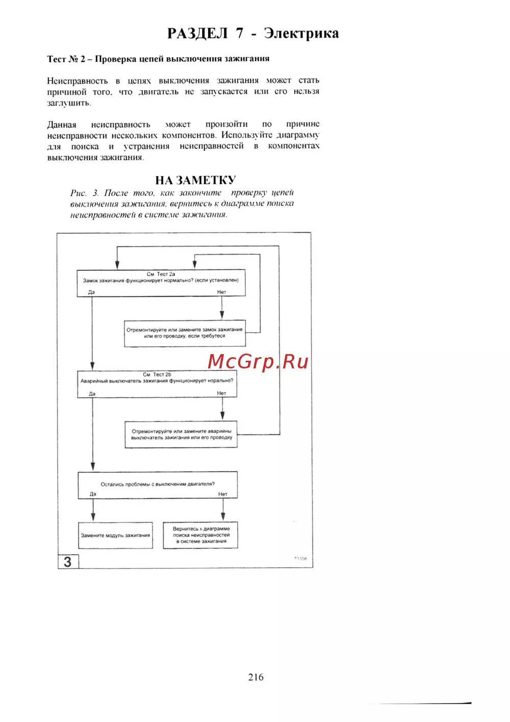 РАЗДЕЛ 7 Электрика Тест 2 Проверка цепей выключения зажигания Неисправность в цепях выключения зажигания может стать причиной того что двигатель нс запускается или его нельзя заглхшить Данная неисправность может произойти по причине неисправности нескольких компонентов Используйте диаграмму для поиска и устранения неисправностей в компонентах выключения зажигания НА ЗАМЕТКУ Рис 3 После того как закончите проверку цепей выключения зажигания вернитесь к диаграмме поиска неисправностей в системе зажигания 216