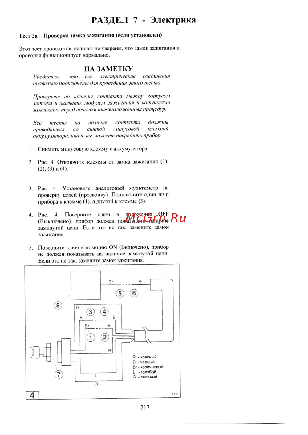 РАЗДЕЛ 7 Электрика Тест 2а Проверка замка зажигания если установлен Этот тест проводится если вы не уверены что замок зажигания и проводка функционирует нормально НА ЗАМЕТКУ Убедитесь что все электрические соединения правильно подключены для проведения этого теста Проверьте на наличие контакта между корпусом мотора и магнето модулем зажигания и катушками зажигания перед началом нижеизложенных процедур Все тесты на наличие контакта должны проводиться со снятой минусовой клеммой аккумулятора иначе вы можете повредить прибор 1 Снимите минусовую клемму с аккумулятора 2 Рис 4 Отключите клеммы от замка зажигания 1 2 3 и 4 3 Рис 4 Установите аналоговый мультиметр на проверку цепей прозвонку Подключите один щуп прибора к клемме 1 а другой к клемме 3 4 Рис 4 Поверните ключ в положение OFF Выключено прибор должен показывать наличие замкнутой цепи Если это не так замените замок зажигания 5 Поверните ключ в позицию ON Включено прибор не должен показывать на наличие замкнутой цепи Если это не так замените замок зажигания 217