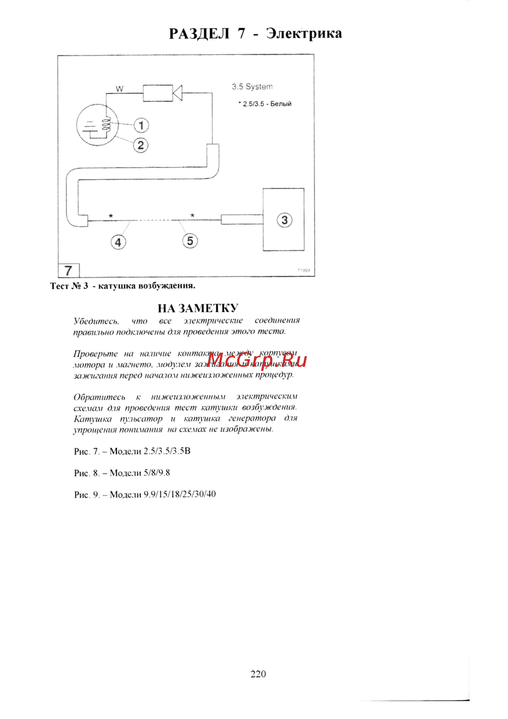 РАЗДЕЛ 7 Электрика НА ЗАМЕТКУ Убедитесь что все электрические соединения правильно подключены для проведения этого теста Проверьте на наличие контакта между корпусом мотора и магнето модулем зажигания и катушками зажигания перед началом нижеизложенных процедур Обратитесь к нижеизложенным электрическим схемам для проведения тест катушки возбуждения Катушка пульсатор и катушка генератора для упрощения понимания на схемах не изображены Рис 7 Модели 2 5 3 5 3 5В Рис 8 Модели 5 8 9 8 Рис 9 Модели 9 9 15 18 25 30 40 220