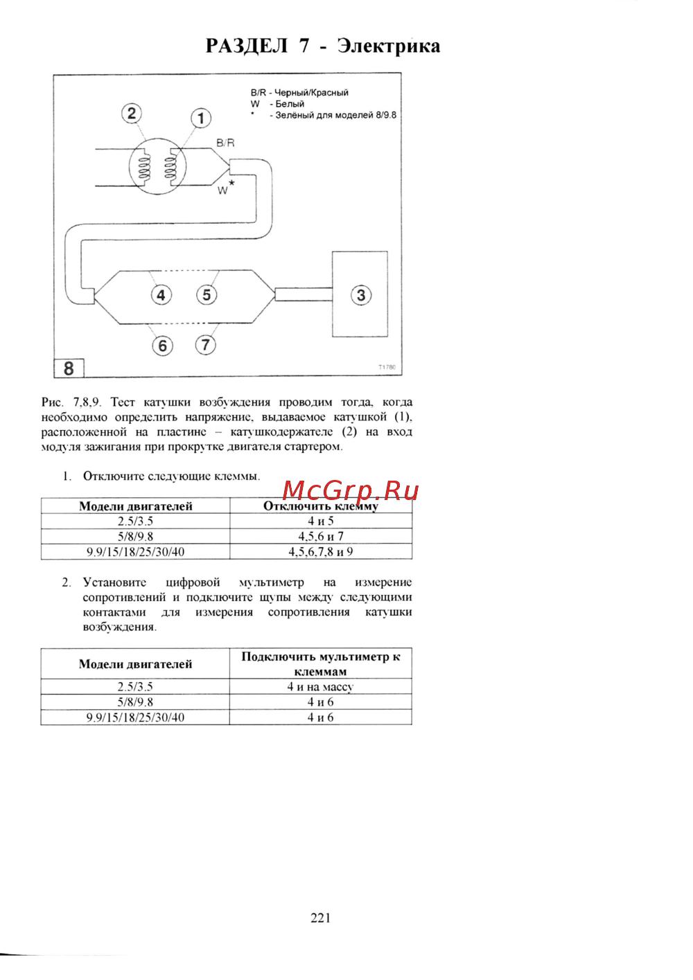 РАЗДЕЛ 7 Электрика Рис 7 8 9 Тест катушки возбуждения проводим тогда когда необходимо определить напряжение выдаваемое катушкой 1 расположенной на пластине кату ш ко держателе 2 на вход МОДУЛЯ зажигания при прокрутке двигателя стартером 1 Отключите следующие клеммы Модели двигателей 2 5 3 5 5 8 9 8 9 9 15 18 25 30 40 2 Отключить клемму 4и5 4 5 6 и 7 4 5 6 7 8 и 9 Установите цифровой мультиметр на измерение сопротивлений и подключите щупы между следующими контактами для измерения сопротивления катушки возбуждения Модели двигателей 2 5 3 5 5 8 9 8 9 9 15 18 25 30 40 Подключить мультиметр к клеммам 4 и на массу 4и6 4и6 221