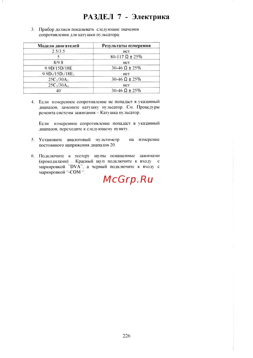 РАЗДЕЛ 7 Электрика 3 Прибор должен показывать следующие значения сопротивления для катушки пульсатора Модели двигателей 2 5 3 5 5 8 9 8 9 9О 15О 18Е 9 9О2 15О2 18Е2 25С2 ЗОА3 25С3 ЗОА4 40 Результаты измерения нет 80 117 0 25 нет 30 46 О 25 нет 30 46 0 25 нет 30 46 О 25 4 Если измеренное сопротивление не попадает в указанный диапазон замените катушку пульсатор См Процедуры ремонта системы зажигания Катушка пульсатор Если измеренное сопротивление попадает в указанный диапазон переходите к следующем пункту 5 Установите аналоговый мультиметр постоянного напряжения диапазон 20 на измерение 6 Подключите к тестер щупы оснащенные зажимами крокодилами Красный щуп подключите к вход с маркировкой ОУА а черный подключите к входу с маркировкой СОМ 226