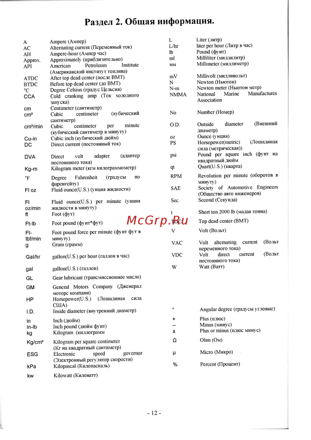 Раздел 2 Общая информация Ampere Ампер Altemating current Переменный ток Ampere hour Ампер час Approximately приблизительно American Petroleum Institute Американский институ т топлива After top dead center после BMT ATDC Before top dead center до BMT BTDC Degree Celsius граду с Цельсия C Cold cranking amp Ток холодного CCA запуска Centimeter сантиметр cm Cubic centimeter кубический cm3 сантиметр crrP min Cubic centimeter per minute кубический сантиметр в минуту Cubic inch ку бический дюйм Cu in Direct current постоянный ток DC А АС АН Approx API DVA Kg m L L lir 1b ml мм Liter литр liter per hour Литр в час Pound фунт Milliliter миллилитр Millimeter миллиметр mV N N m NMMA Millivolt милливольт Newton Ньютон Newton meter Ньютон метр National Marine Manufactures Association No Number Номер O D Outside diameter Внешний диаметр Ounce унция Horsepower metric Лошадиная сила метрическая Pound per square inch фунт на квадратный дюйм Quart U S кварта oz PS psi Direct volt adapter адаптер постоянного тока Kilogram meter кгм килограммометр qt RPM Fl oz Degree Fahrenheit градусы по Фаренгейту Fluid ounce U S унция жидкости Fl oz min ft Fluid ounce U S per minute унция жидкости в минуту Foot фут Sec Revolution per minute оборотов в минуту Society of Automotive Engineers Общество авто инженеров Second Секунда t Short ton 2000 1b малая тонна Ft lb Foot pound фу нт фут TDC Top dead center BMT FtIbf min g Foot pound force per minute фунт фут в минуту Gram грамм V Volt Вольт VAC Gal hr gallon U S per hour галлон в час VDC gal gallon U S галлон W Volt altemating current Вольт переменного тока Volt direct current Вольт постоянного тока Watt Ватт GL Gear lubricant трансмиссионное масло GM General Motors Company Дженерал моторе компани Horsepower U S Лошадиная сила США Inside diameter вну тренний диаметр о Angular degree градусы угловые Inch дюйм Inch pound дюйм фунт Kilogram киллограмм Plus плюс Minus минус Plus or minus плюс минус Q Olim Ом M Micro Микро kPa Kilogram per square centimeter Кг на квадратный сантиметр Electronic speed governor Электронный регулятор скорости Kilopascal Килопаскаль Percent Процент kw Kilowatt Киловатт F HP I D in In lb kg Kg cm2 ESG SAE 12