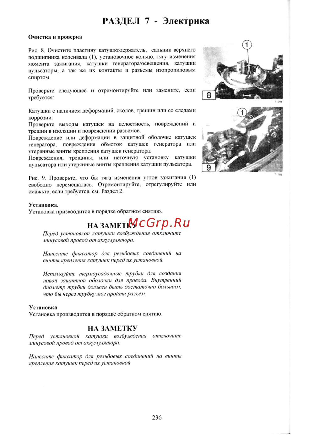 РАЗДЕЛ 7 Электрика Очистка и проверка Рис 8 Очистите пластин кату ш ко держатель сальник верхнего подшипника коленвала 1 установочное кольцо тягу изменения момента зажигания катушки генератора освещения катушки пульсаторы а так же их контакты и разъемы изопропиловым спиртом Проверьте следующее и отремонтируйте или замените если требуется Катушки с наличием деформаций сколов трещин или со следами коррозии Проверьте выходы катушек на целостность повреждений и трещин в изоляции и повреждении разъемов Повреждение или деформации в защитной оболочке катушек генератора повреждения обмоток катушек генератора или утерянные винты крепления катушек генератора Повреждения трещины или неточную установку катушки пульсатора или утерянные винты крепления кату шки пу льсатора Рис 9 Проверьте что бы тяга изменения углов зажигания 1 свободно перемещалась Отремонтируйте отрегулируйте или смажьте если требу ется см Раздел 2 Установка Установка призвоодится в порядке обратном снятию НА ЗАМЕТКУ Перед установкой катушки возбуждения отключите минусовой провод от аккумулятора Нанесите фиксатор для резьбовых соединений на винты крепления катушек перед их установкой Используйте термоусадочные трубки для создания новой защитной оболочки для провода Внутренний диаметр трубки должен быть достаточно большим что бы через трубку мог пройти разъем Установка Установка производится в порядке обратном снятию НА ЗАМЕТКУ Перед установкой катушки возбуждения отключите минусовой провод от аккумулятора Нанесите фиксатор для резьбовых соединений на винты крепления катушек перед их установкой 236