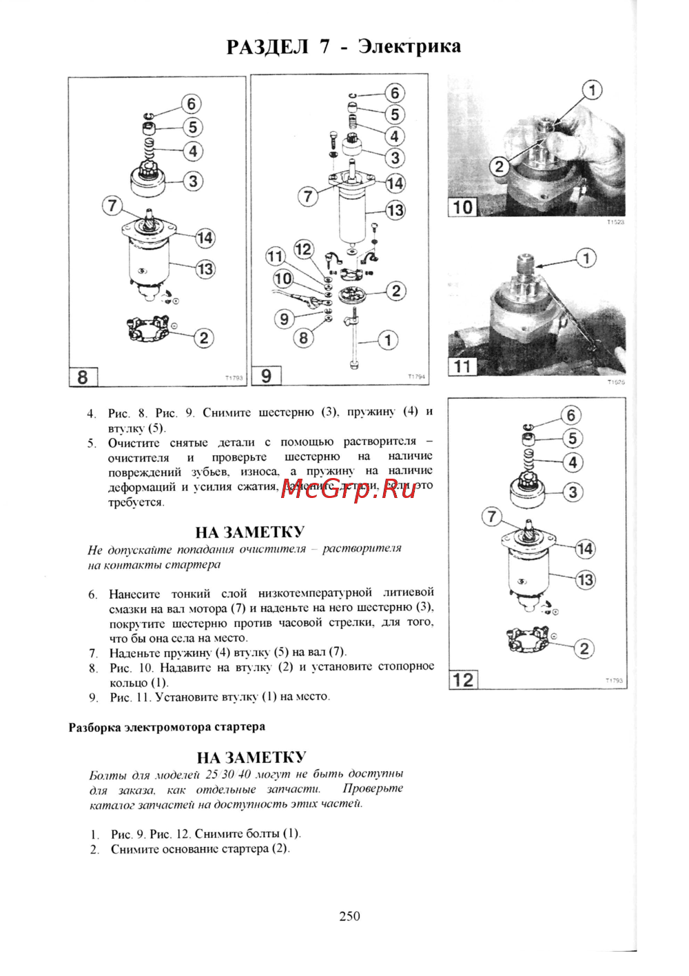РАЗДЕЛ 7 Электрика 4 Рис 8 Рис 9 Снимите шестерню 3 пружину 4 и втулку 5 5 Очистите снятые детали с помощью растворителя очистителя и проверьте шестерню на наличие повреждений зубьев износа а пружину на наличие деформаций и усилия сжатия замените детали если это требуется НА ЗАМЕТКУ Не допускайте попадания очистителя растворителя на контакты стартера 6 Нанесите тонкий слой низкотемпературной литиевой смазки на вал мотора 7 и наденьте на него шестерню 3 покрутите шестерню против часовой стрелки для того что бы она села на место 7 Наденьте пружину 4 втулку 5 на вал 7 8 Рис 10 Надавите на втулку 2 и установите стопорное кольцо 1 9 Рис 11 Установите втулку 1 на место Разборка электромотора стартера НА ЗАМЕТКУ Болты для моделей 25 30 40 могут не быть доступны для заказа как отдельные запчасти Проверьте катаюг запчастей на доступность этих частей 1 Рис 9 Рис 12 Снимите болты 1 2 Снимите основание стартера 2 250