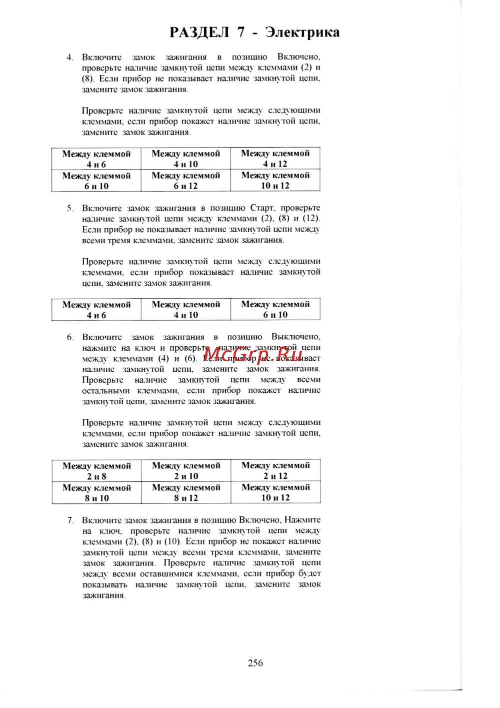 РАЗДЕЛ 7 Электрика 4 Включите замок зажигания в позицию Включено проверьте наличие замкнутой цепи между клеммами 2 и 8 Если прибор нс показывает наличие замкнутой цепи замените замок зажигания Проверьте наличие замкнутой цепи между следующими клеммами если прибор покажет наличие замкнутой цепи замените замок зажигания Между клеммой 4и6 Между клеммой би 10 Между клеммой 4 и 10 Между клеммой 6 и 12 Между клеммой 4 и 12 Между клеммой 10 и 12 5 Включите замок зажигания в позицию Старт проверьте наличие замкнутой цепи между клеммами 2 8 и 12 Если прибор не показывает наличие замкнутой цепи между всеми тремя клеммами замените замок зажигания Проверьте наличие замкнутой цепи между следующими клеммами если прибор показывает наличие замкнутой цепи замените замок зажигания Между клеммой 4и6 Между клеммой 4 и 10 Между клеммой 6 и 10 6 Включите замок зажигания в позицию Выключено нажмите на ключ и проверьте наличие замкнутой цепи между клеммами 4 и 6 Если прибор не показывает наличие замкнутой цепи замените замок зажигания Проверьте наличие замкнутой цепи между всеми остальными клеммами если прибор покажет наличие замкнутой цепи замените замок зажигания Проверьте наличие замкнутой цепи между следующими клеммами если прибор покажет наличие замкнутой цепи замените замок зажигания Между клеммой 2и8 Между клеммой 8 и 10 Между клеммой 2 и 10 Между клеммой 8 и 12 Между клеммой 2 и 12 Между клеммой 10и12 7 Включите замок зажигания в позицию Включено Нажмите на ключ проверьте наличие замкнутой цепи между клеммами 2 8 и 10 Если прибор не покажет наличие замкнутой цепи между всеми тремя клеммами замените замок зажигания Проверьте наличие замкнутой цепи между всеми оставшимися клеммами если прибор будет показывать наличие замкнутой цепи замените замок зажигания 256