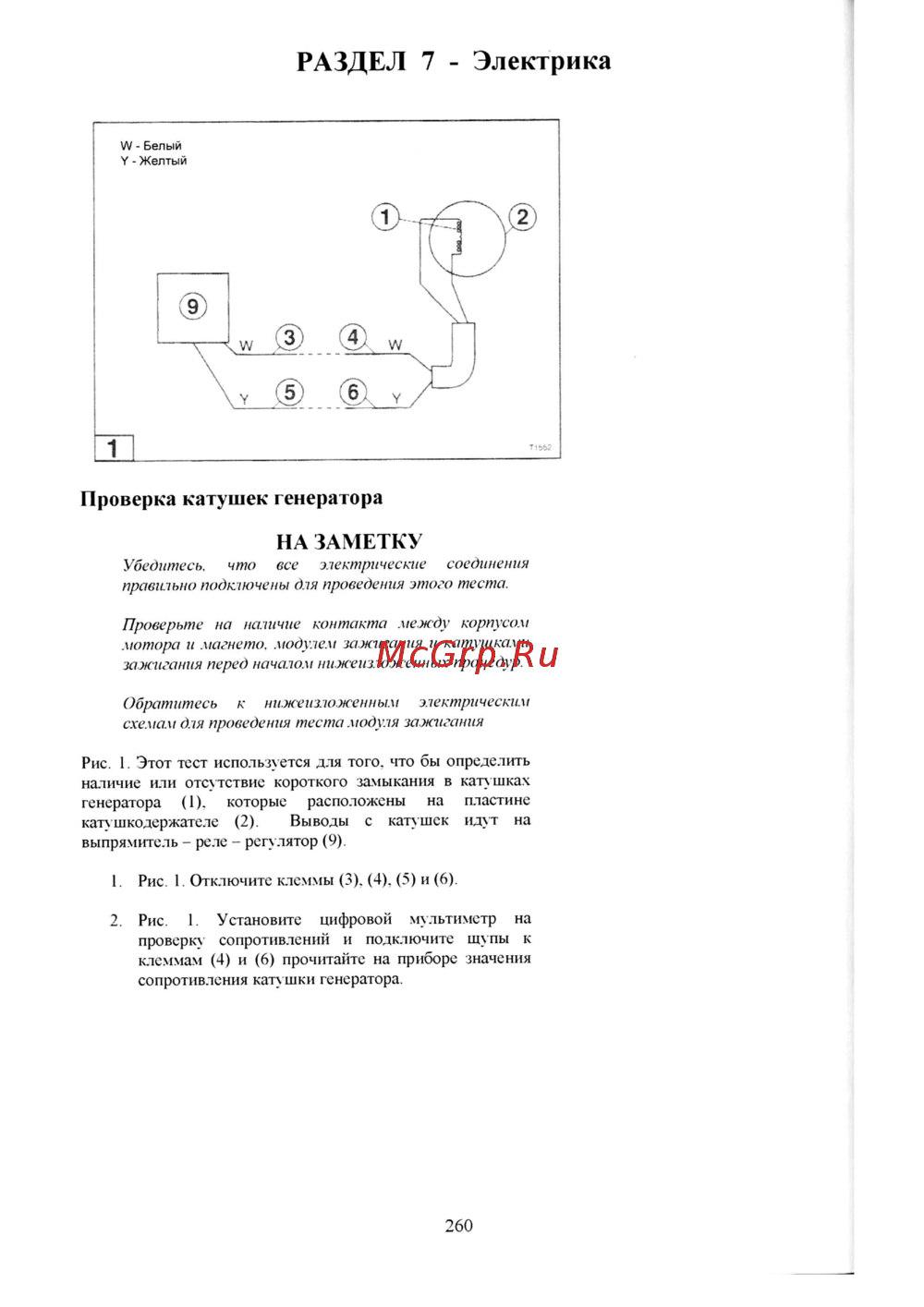 РАЗДЕЛ 7 Электрика Проверка катушек генератора НА ЗАМЕТКУ Убедитесь что все электрические соединения правильно подключены для проведения этого теста Проверьте на наличие контакта между корпусом мотора и магнето модулем зажигания и катушками зажигания перед началом нижеизложенных процедур Обратитесь к нижеизложенным электрическим схемам для проведения теста модуля зажигания Рис 1 Этот тест используется для того что бы определить наличие или отсутствие короткого замыкания в катушках генератора 1 которые расположены на пластине кату шко держателе 2 Выводы с катушек идут на выпрямитель реле регулятор 9 1 Рис 1 Отключите клеммы 3 4 5 и 6 2 Рис 1 Установите цифровой мультиметр на проверку сопротивлений и подключите щупы к клеммам 4 и 6 прочитайте на приборе значения сопротивления кату шки генератора 260