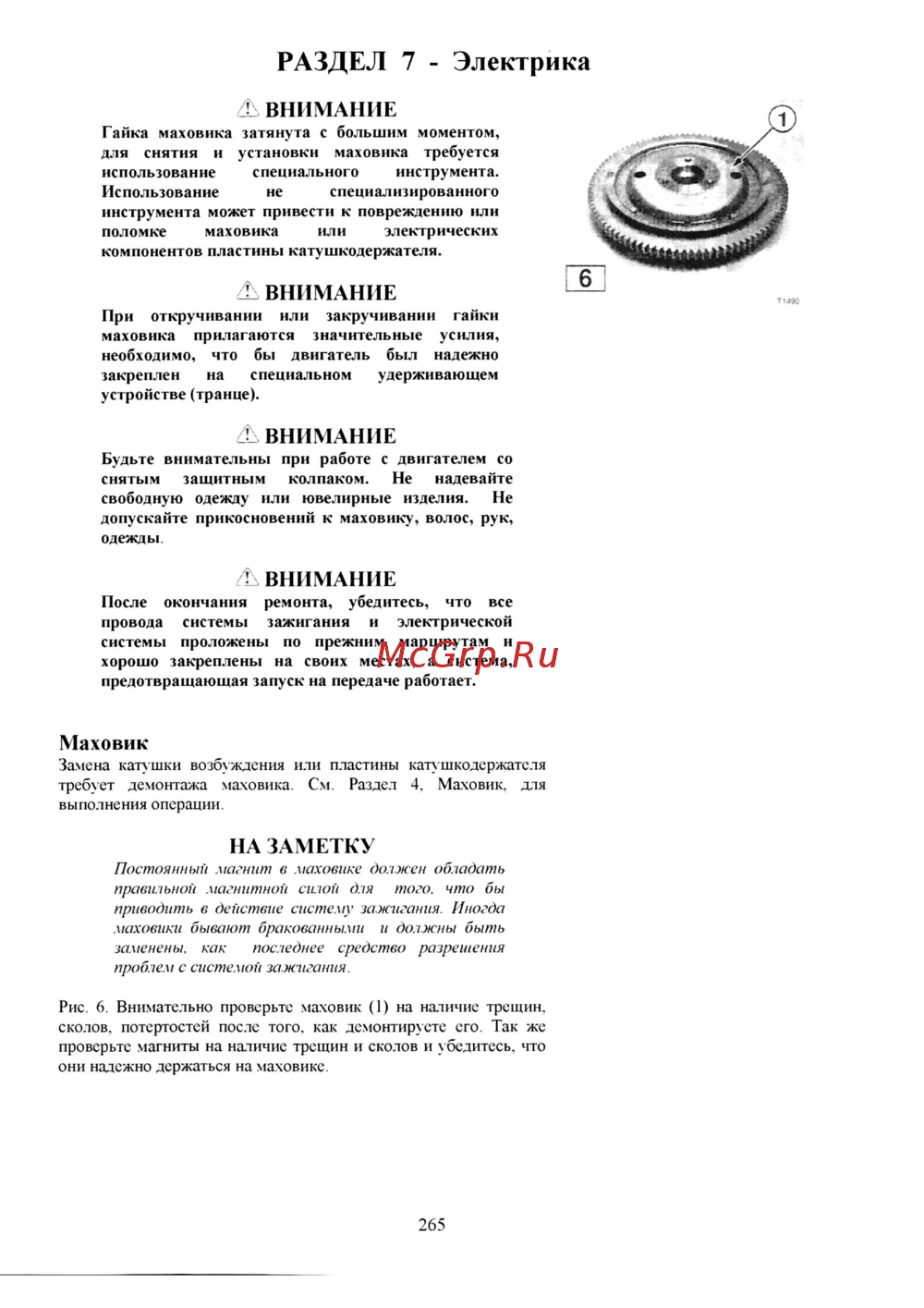 РАЗДЕЛ 7 Электрика Ж ВНИМАНИЕ Гайка маховика затянута с большим моментом для снятия и установки маховика требуется использование специального инструмента Использование не специализированного инструмента может привести к повреждению или поломке маховика или электрических компонентов пластины катушкодержателя А ВНИМАНИЕ Т149С При откручивании или закручивании гайки маховика прилагаются значительные усилия необходимо что бы двигатель был надежно закреплен на специальном удерживающем устройстве транце ВНИМАНИЕ Будьте внимательны при работе с двигателем со снятым защитным колпаком Не надевайте свободную одежду или ювелирные изделия Не допускайте прикосновений к маховику волос рук одежды А ВНИМАНИЕ После окончания ремонта убедитесь что все провода системы зажигания и электрической системы проложены по прежним маршрутам и хорошо закреплены на своих местах а система предотвращающая запуск на передаче работает Маховик Замена катушки возбуждения или пластины катушкодержателя требует демонтажа маховика См Раздел 4 Маховик для выполнения операции НА ЗАМЕТКУ Постоянный магнит в маховике должен обладать правильной магнитной силой для того что бы приводить в действие систему зажигания Иногда маховики бывают бракованными и должны быть заменены как последнее средство разрешения проблем с системой зажигания Рис 6 Внимательно проверьте маховик 1 на наличие трещин сколов потертостей после того как демонтируете его Так же проверьте магниты на наличие трещин и сколов и убедитесь что они надежно держаться на маховике 265