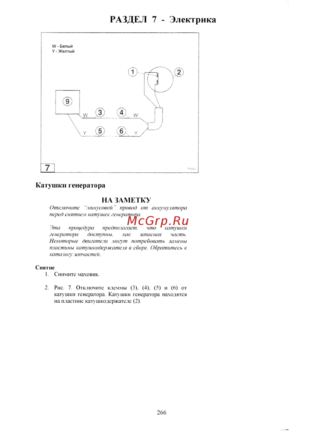 РАЗДЕЛ 7 Электрика Катушки генератора НА ЗАМЕТКУ Отключите минусовой провод от аккумулятора перед снятием катушек генератора Эта процедура предполагает что катушки генератора доступны как запасная часть Некоторые двигатели могут потребовать замены пластины кату шкодержателя в сборе Обратитесь к каталогу запчастей Снятие 1 Снимите маховик 2 Рис 7 Отключите клеммы 3 4 5 и 6 от катушки генератора Катушки генератора находятся на пластине катушкодержателе 2 266