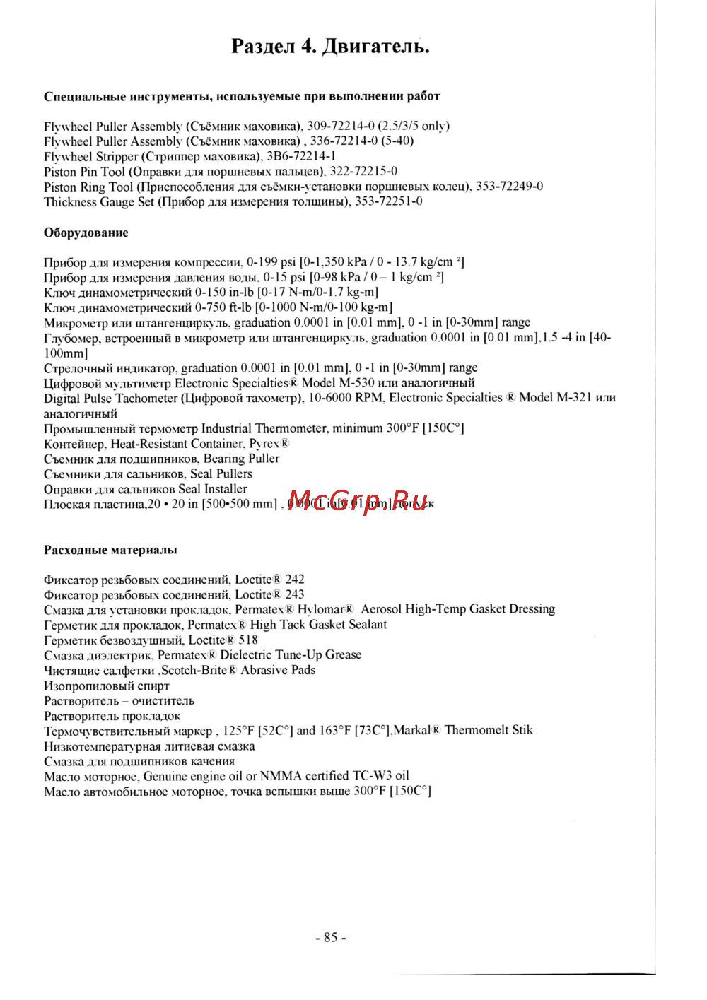 Раздел 4 Двигатель Специальные инструменты используемые при выполнении работ Flywheel Puller Assembly Съёмник маховика 309 72214 0 2 5 3 5 only Flywheel Puller Assembly Съёмник маховика 336 72214 0 5 40 Flywheel Stripper Стриппер маховика 3B6 72214 1 Piston Pin Tool Оправки для поршневых пальцев 322 72215 0 Piston Ring Tool Приспособления для съёмки установки поршневых колец 353 72249 0 Thickness Gauge Set Прибор для измерения толщины 353 72251 0 Оборудование Прибор для измерения компрессии 0 199 psi 0 1 350 kPa 0 13 7 kg cm 2 Прибор для измерения давления воды 0 15 psi 0 98 kPa 0 1 kg cm 2 Ключ динамометрический 0 150 in lb 0 17 N m 0 1 7 kg m Ключ динамометрический 0 750 ft lb 0 1000 N m 0 100 kg m Микрометр или штангенциркуль graduation 0 0001 in 0 01 mm 0 1 in 0 30mm range Глубомер встроенный в микрометр или штангенциркуль graduation 0 0001 in 0 01 mm 1 5 4 in 40100mm Стрелочный индикатор graduation 0 0001 in 0 01 mm 0 1 in 0 30mm range Цифровой мультиметр Electronic Specialties R Model М 530 или аналогичный Digital Pulse Tachometer Цифровой тахометр 10 6000 RPM Electronic Specialties 1 Model М 321 или аналогичный Промышленный термометр Industrial Thermometer minimum 300 F 150C Контейнер Heat Resistant Container Pyrex R Съемник для подшипников Bearing Puller Съемники для сальников Seal Pullers Оправки для сальников Seal Installer Плоская пластина 20 20 in 500 500 mm 0 0001 in 0 01 mm дот ек Расходные материалы Фиксатор резьбовых соединений Loctite R 242 Фиксатор резьбовых соединений Loctite R 243 Смазка для установки прокладок PermatcxR HylomarR Aerosol High Temp Gasket Dressing Герметик для прокладок PermatcxR High Tack Gasket Sealant Герметик безвоздушный Loctite 518 Смазка диэлектрик Permatcx R Dielectric Tune Up Grease Чистящие салфетки Scotch Britc R Abrasive Pads Изопропиловый спирт Растворитель очиститель Растворитель прокладок Термочувствительный маркер 125 F 52С and 163 F 73C Markal R Thermomelt Stik Низкотемпературная литиевая смазка Смазка для подшипников качения Масло моторное Genuine engine oil orNMMA certified TC W3 oil Масло автомобильное моторное точка вспышки выше 300 F 150С 85