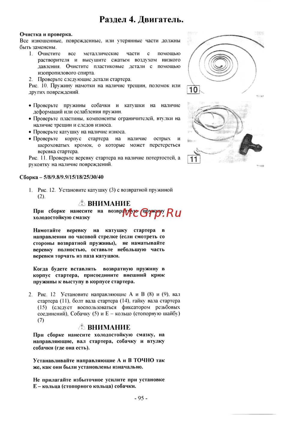 Раздел 4 Двигатель Очистка и проверка Все изношенные поврежденные или утерянные части должны быть заменены 1 Очистите все металлические части с помощью растворителя и высушите сжатым воздухом низкого давления Очистите пластиковые детали с помощью изопропилового спирта 2 Проверьте следующие детали стартера Рис 10 Пружину намотки на наличие трещин поломок или других повреждений Т11Я7 Проверьте пружины собачки и катушки на наличие деформаций или ослабления пружин Проверьте пластины компоненты ограничителей втулки на наличие трещин и следов износа Проверьте катушку на наличие износа Проверьте корпус стартера на наличие острых и шероховатых кромок о которые может перетереться веревка стартера Рис 11 Проверьте веревку стартера на наличие потертостей а рукоятку на наличие повреждений Сборка 5 8 9 8 9 9 15 18 25 30 40 1 Рис 12 Установите катушку 3 с возвратной прхжиной 2 Ь ВНИМАНИЕ При сборке нанесите на возвратную пружину холодостойкую смазку Намотайте веревку на катушку стартера в направлении по часовой стрелке если смотреть со стороны возвратной пружины не наматывайте веревку полностью оставьте небольшую часть веревки торчать из паза катушки Когда будете вставлять возвратную пружину в корпус стартера присоедините внешний крюк пружины к выступу в корпусе стартера 2 Рис 12 Установите направляющие А и В 8 и 9 вал стартера 11 болт вала стартера 14 гайку вала стартера 15 следует воспользоваться фиксатором резьбовых соединений Собачку 5 и Е кольцо стопорную шайбу 7 А ВНИМАНИЕ При сборке нанесите холодостойкую смазку на направляющие вал стартера собачку и втулку собачки где она есть Устанавливайте направляющие А и В ТОЧНО так же как они были установлены изначально Не прилагайте избыточное усилите при установке Е кольца стопорного кольца собачки 95 П