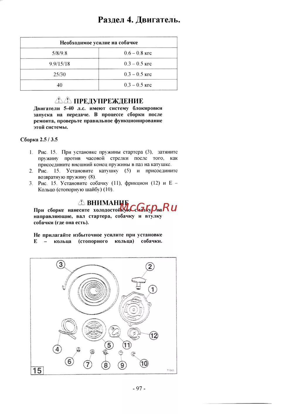 Раздел 4 Двигатель Необходимое усилие на собачке 5 8 98 0 6 0 8 кге 9 9 15 18 0 3 0 5 кге 25 30 0 3 0 5 кге 40 0 3 0 5 кге А А ПРЕДУПРЕЖДЕНИЕ Двигатели 5 40 л с имеют систему блокировки запуска на передаче В процессе сборки после ремонта проверьте правильное функционирование этой системы Сборка 2 5 3 5 1 Рис 15 При установке пружины стартера 3 затяните пружину против часовой стрелки после того как присоедините внешний конец пружины в паз на катушке 2 Рис 15 Установите катушку 5 и присоедините возвратную пружину 8 3 Рис 15 Установите собачку 11 фрикцион 12 и Е Кольцо стопорную шайбу 10 ВНИМАНИЕ При сборке нанесите холодостойкую смазку на направляющие вал стартера собачку и втулку собачки где она есть Не прилагайте избыточное усилите при установке Е кольца стопорного кольца собачки 97