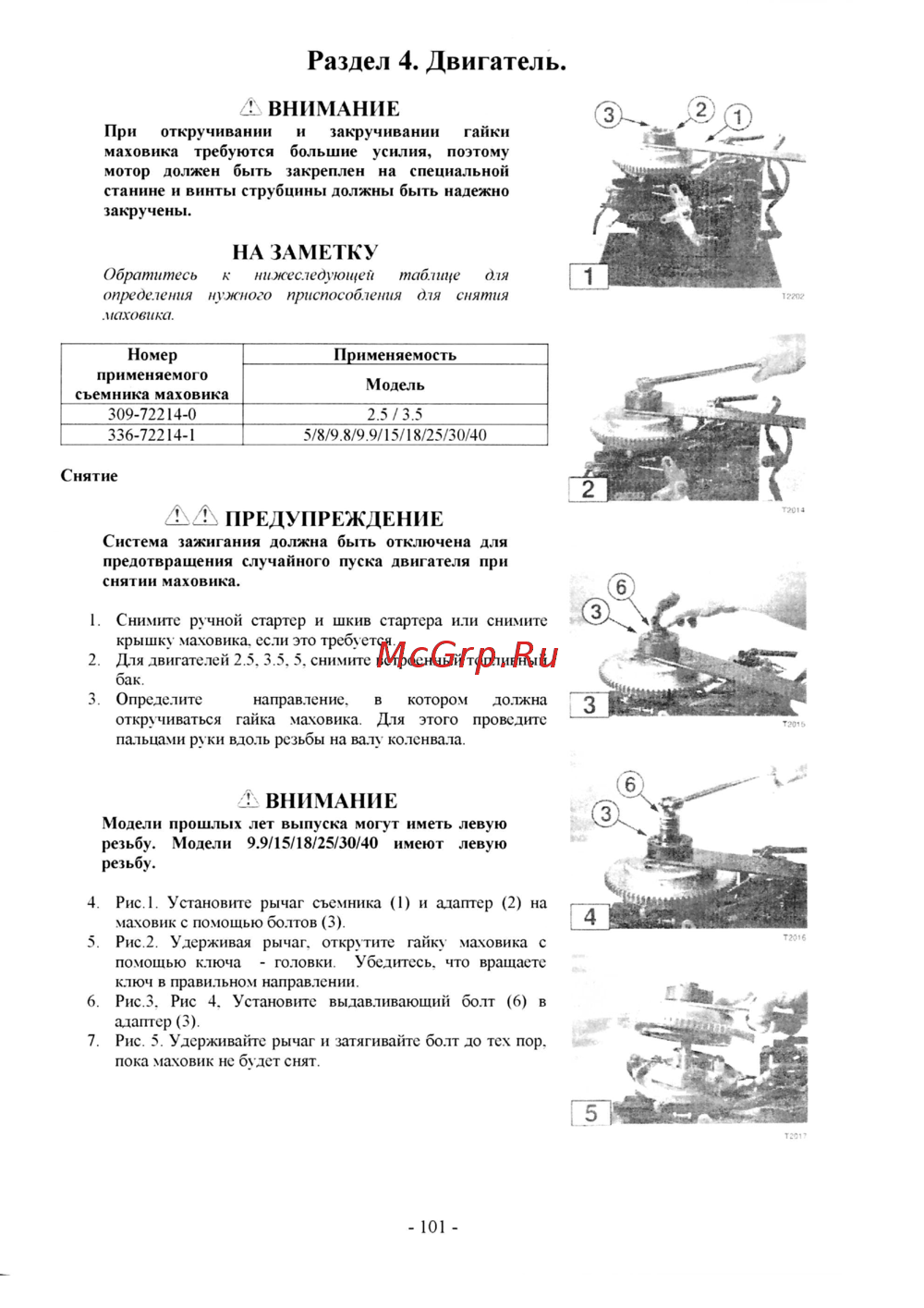 Раздел 4 Двигатель 1 ВНИМАНИЕ При откручивании и закручивании гайки маховика требуются большие усилия поэтому мотор должен быть закреплен на специальной станине и винты струбцины должны быть надежно закручены НА ЗАМЕТКУ Обратитесь к нижеследующей таблице для определения нужного приспособления для снятия маховика Номер применяемого съемника маховика 309 72214 0 336 72214 1 12202 Применяемость Модель 2 5 3 5 5 8 9 8 9 9 15 18 25 30 40 Снятие А А ПРЕДУПРЕЖДЕНИЕ Т2014 Система зажигания должна быть отключена для предотвращения случайного пуска двигателя при снятии маховика 1 Снимите ручной стартер и шкив стартера или снимите крышку маховика если это требуется 2 Для двигателей 2 5 3 5 5 снимите встроенный топливный бак 3 Определите направление в котором должна откручиваться гайка маховика Для этого проведите пальцами руки вдоль резьбы на валу коленвала Ь ВНИМАНИЕ Модели прошлых лет выпуска могут иметь левую резьбу Модели 9 9 15 18 25 30 40 имеют левую резьбу 4 Рис 1 Установите рычаг съемника 1 и адаптер 2 на маховик с помощью болтов 3 5 Рис 2 Удерживая рычаг открутите гайку маховика с помощью ключа головки Убедитесь что вращаете ключ в правильном направлении 6 Рис 3 Рис 4 Установите выдавливающий болт 6 в адаптер 3 7 Рис 5 Удерживайте рычаг и затягивайте болт до тех пор пока маховик не будет снят 101 Т2015